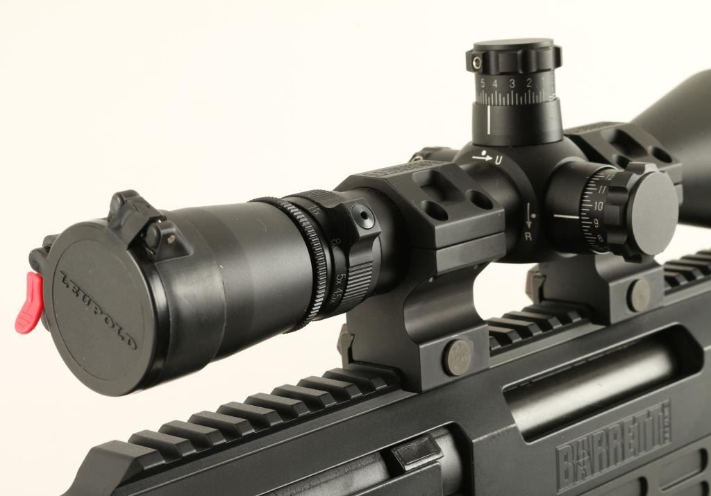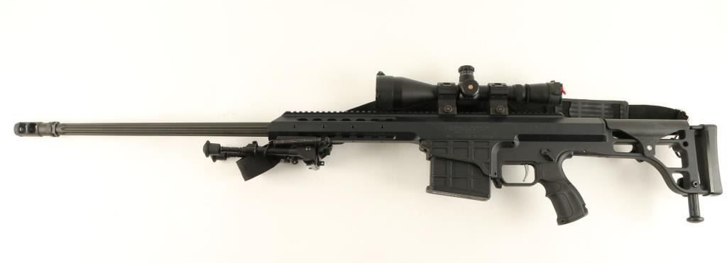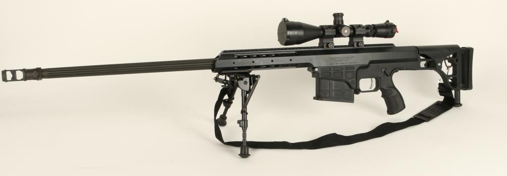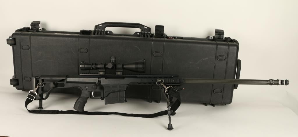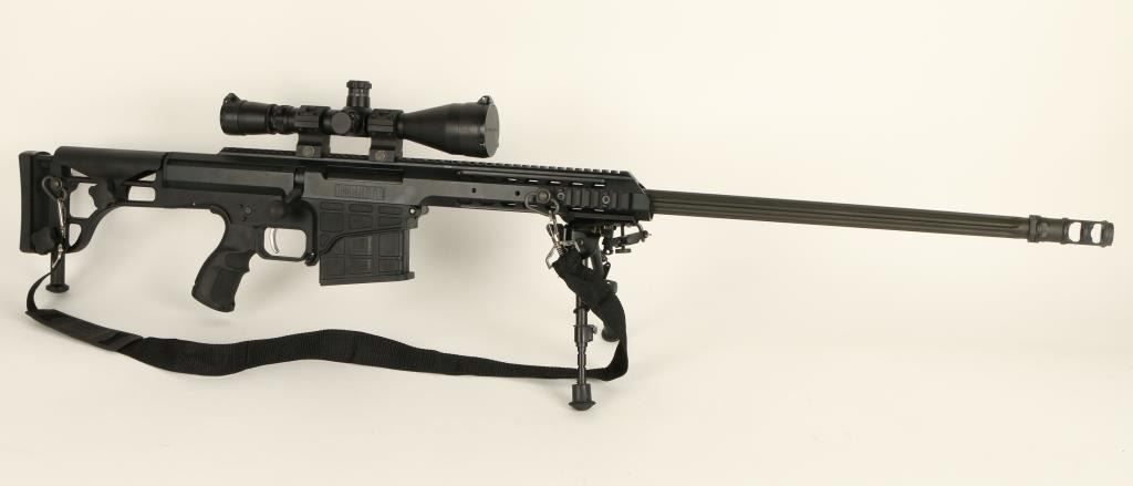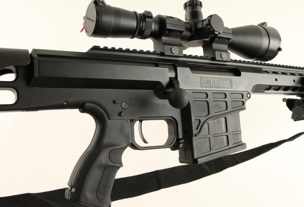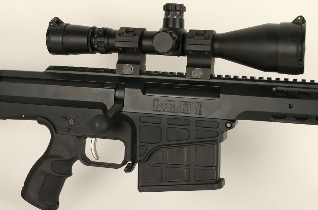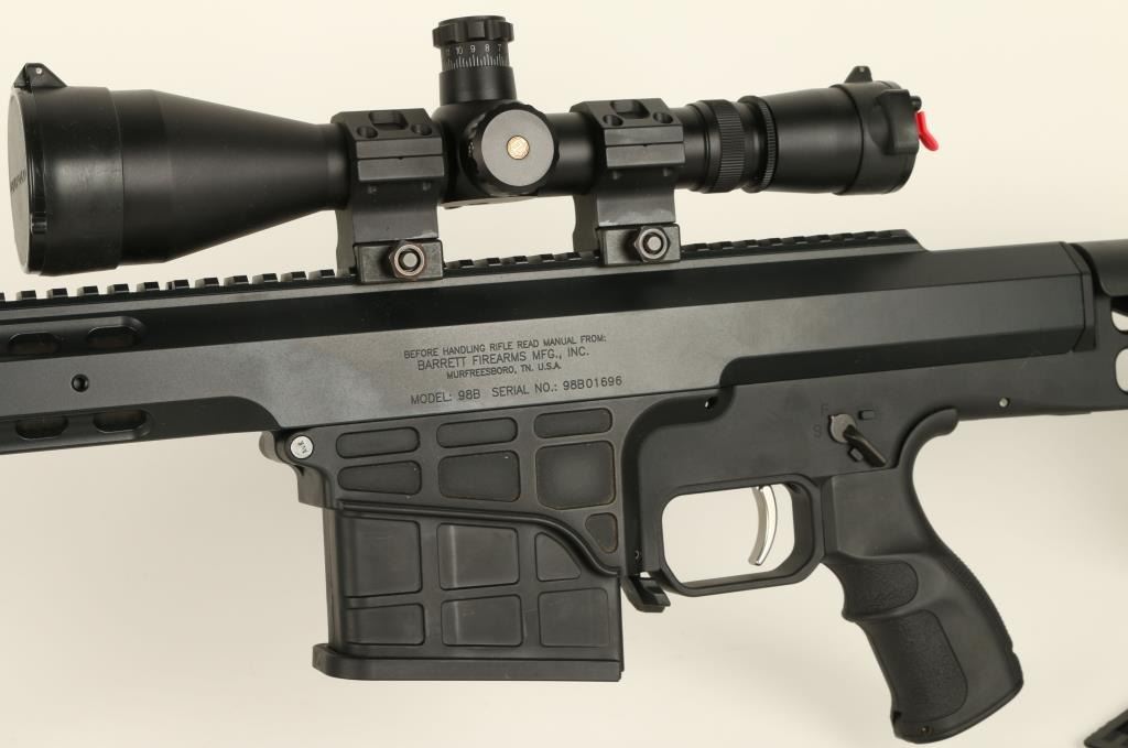 Barrett Model 98B bolt action rifle, .338 caliber, 28” barrel, S/N 98B01696, mat black finish, retractable bi-pod, adjustable stock, woven sling, mounted with a Leupold Mil Dot Reticle scope with fine optics in overall like new condition andcontained in a heavy duty Pelican brand padded hard case with a total of two magazines, a cleaning kit and instructions manuals for the rifle and the scope (Modern). Est.: $4,000-$8,000.