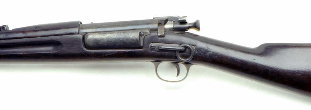 U.S. Springfield Krag Model 1896 bolt action rifle, .30-40 Krag caliber, 22” round barrel, S/N 78974, in overall very good condition displaying a dark patina on metal surfaces, good bore, crisp action, good markings and very good wood withpartially visible circle P proof and partially visible inspector’s cartouche; cleaning rod in butt trap. Would be interesting to contact Springfield Research Service on this Spanish-American War era Krag. (Antique).Est.: $2,000-$4,000.