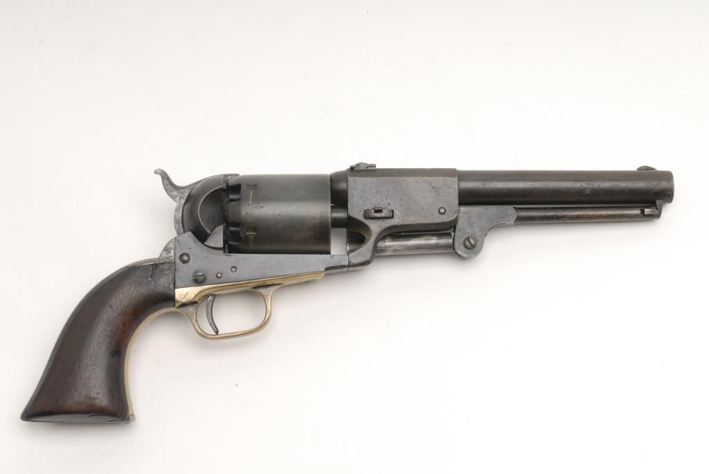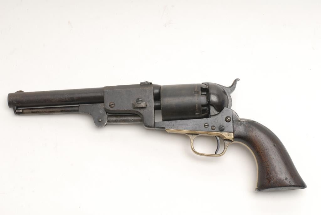 Colt Third Model Dragoon percussion revolver, .44 caliber, 7.5” barrel, cut for shoulder stock, S/N 16702, in overall good to very good condition displaying a dark patina to metal surfaces, good action, overall good grips; with expected wearfrom handling and use; dark bore; accompanied by note from consignor indicating “found in Shreveport from long-time gun dealer, 40-50 years ago; came from Shreveport resident but dealer would not tell me the people’s name”.(Antique). Est.: $3,000-$6,000.