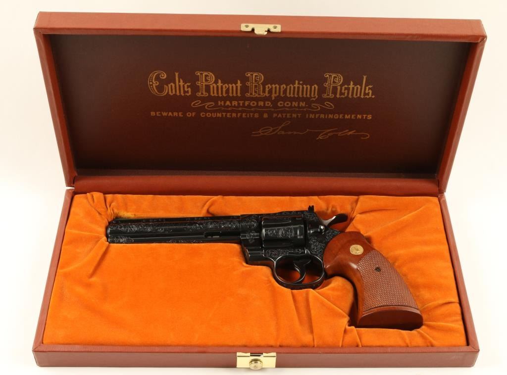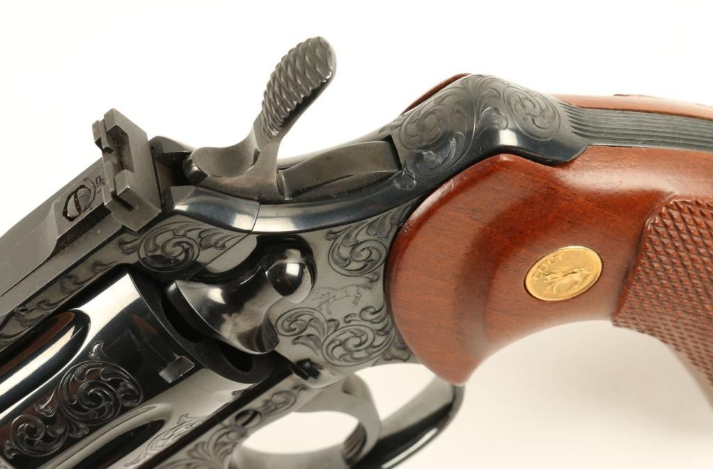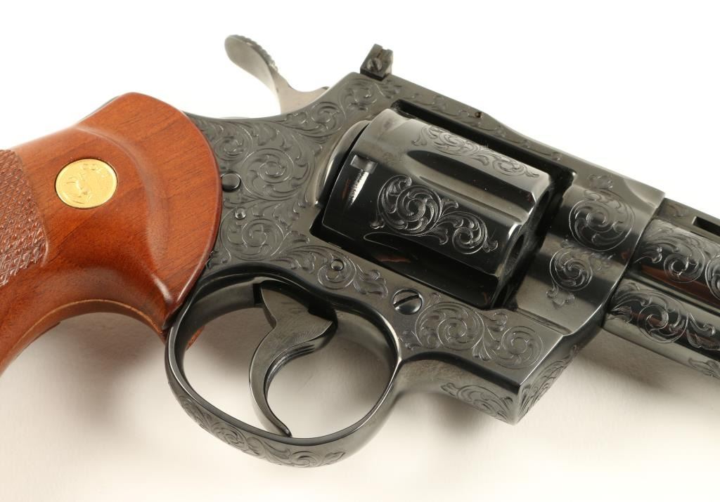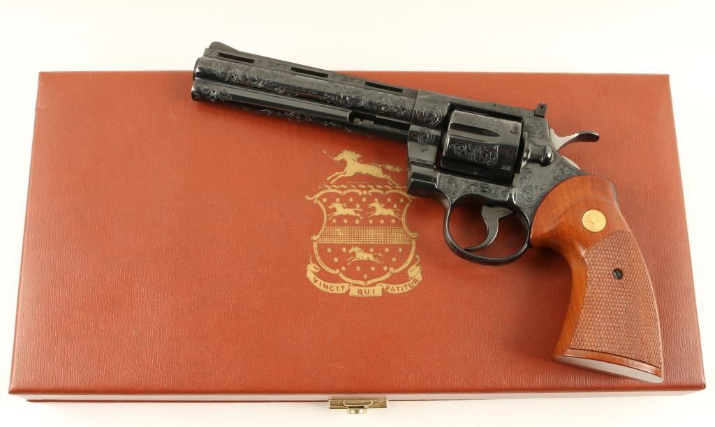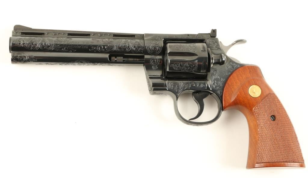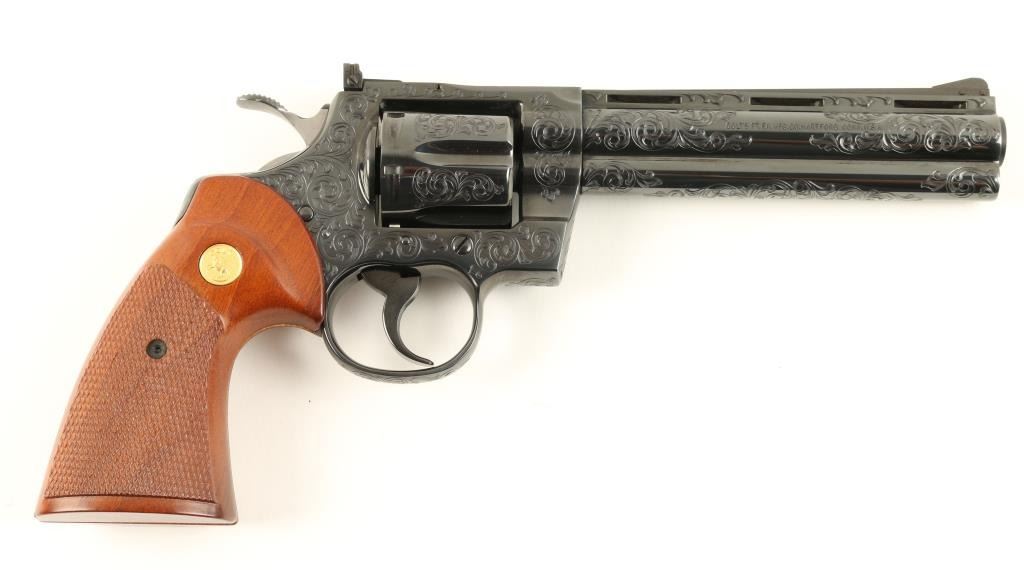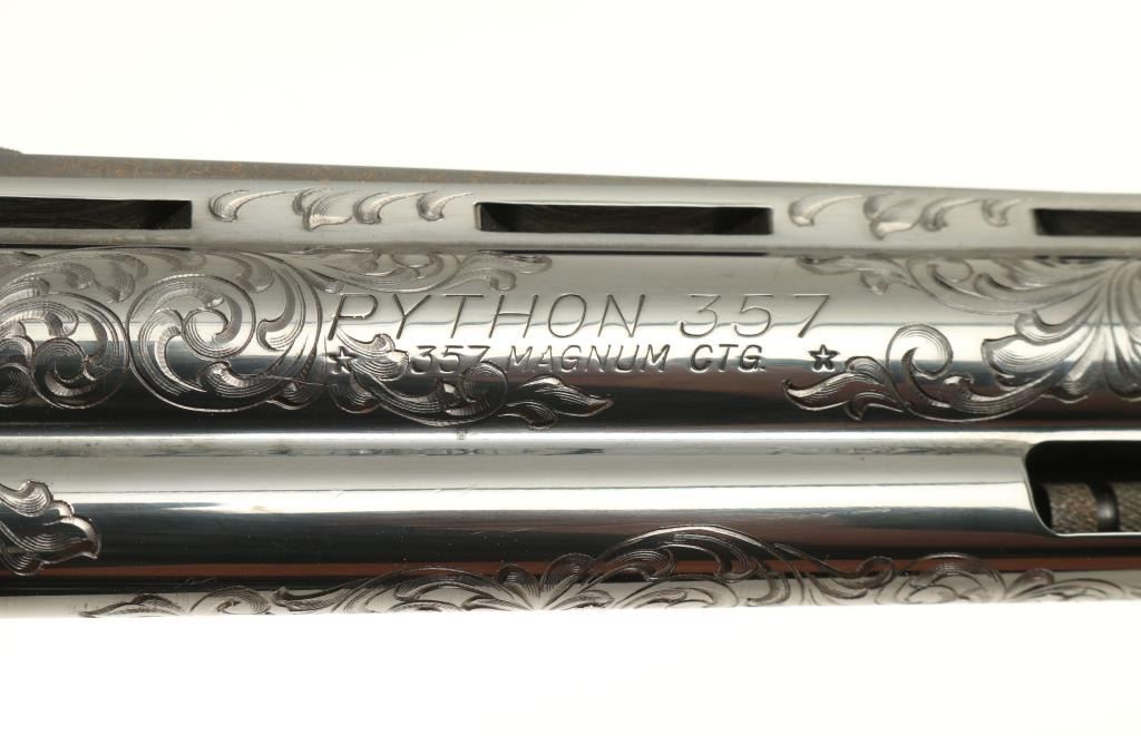 Lot 201 Outstanding engraved Colt Python DA revolver, .357 Magnum caliber, 6” ventilated rib barrel, S/N 0