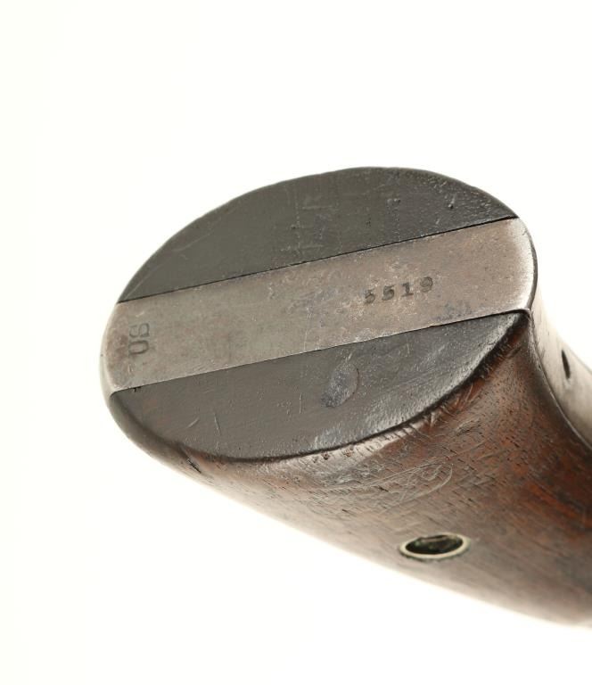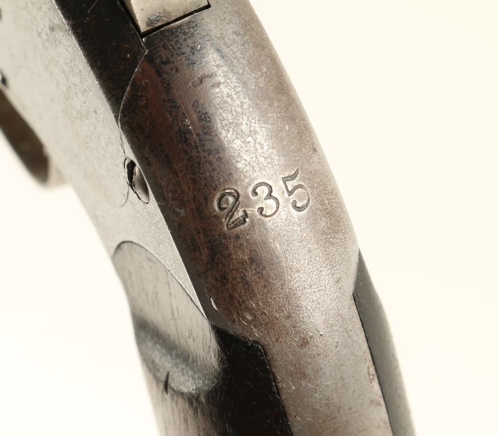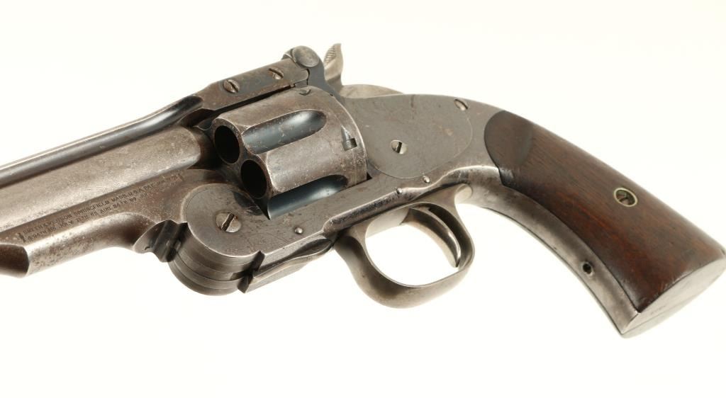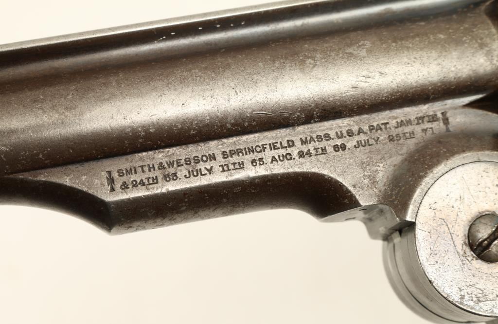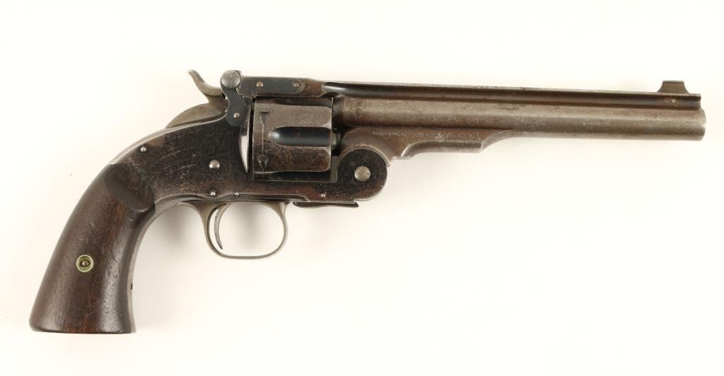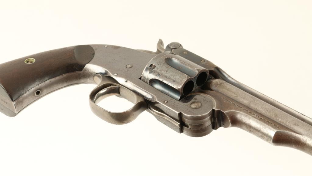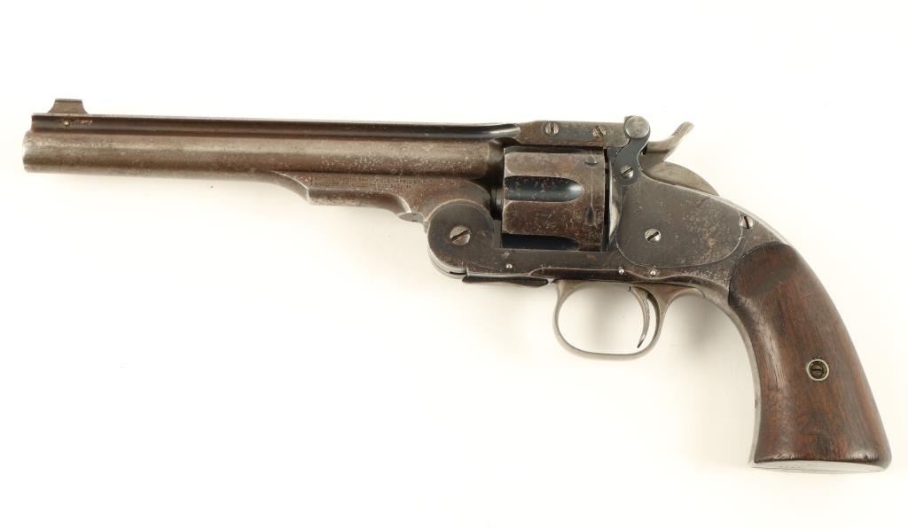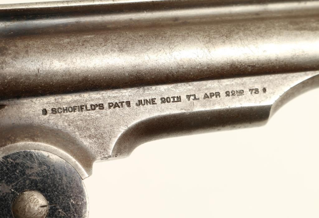 Smith & Wesson 2nd Model Schofield revolver, .45 S&W caliber, 7” barrel, S/N 5519 with additional number “235” period stamped on the backstrap; blued finish, smooth wood grips with partially visible inspector’s cartouches on each grip and“US” stamped on the rear of the butt strap. This revolver is in overall very good + condition showing considerable original blue finish on the frame and cylinder with a brown patina to the barrel and traces of original blue in protectedareas. The cylinder is numbered 7514; the action is crisp, the markings sharp and the bore very good to near fine. The grips are also very good overall. Accompanied by a folder with information from the Man At Arms October 2000 edition, alsofrom David Chicoine’s book “Smith & Wesson Sixguns of the Old West”, Charles Pate’s book “Smith & Wesson American Model” and other related information concerning researchers’ opinions that Schofields displaying this secondary numbering onthe backstrap area were U.S. military sidearms provided to the San Francisco Police Department during a time of great civil unrest in the city by the bay at the end of the 1870’s. (Antique). Est.: $4,000-$8,000.
