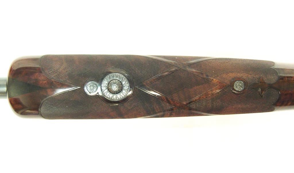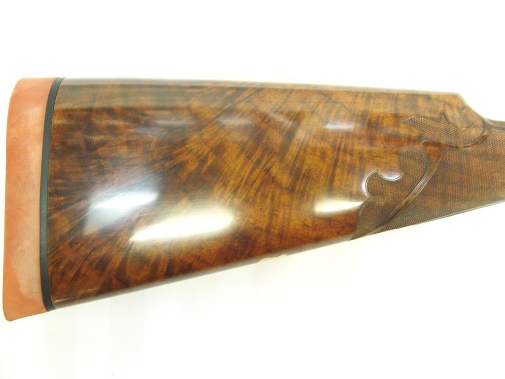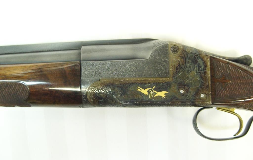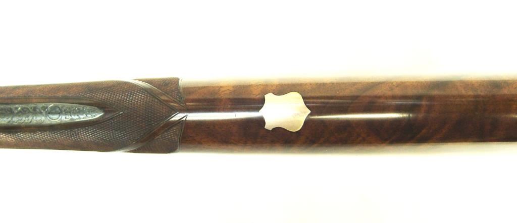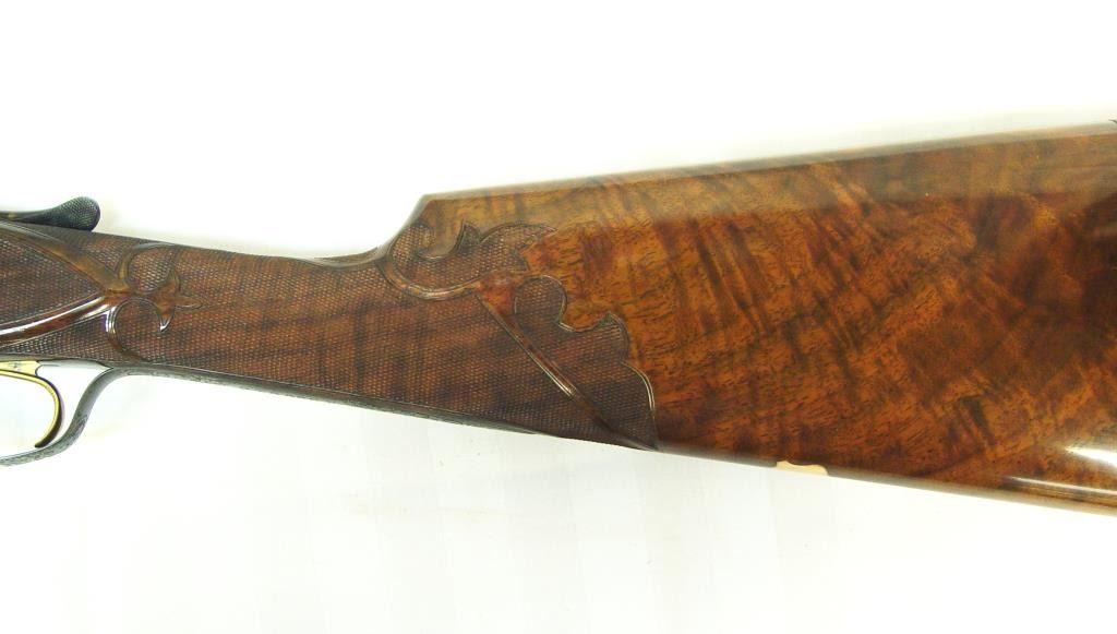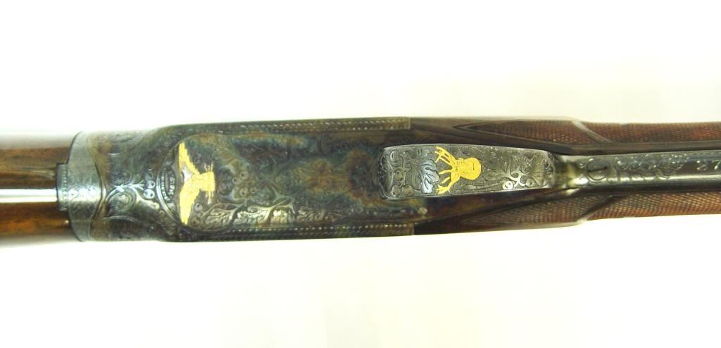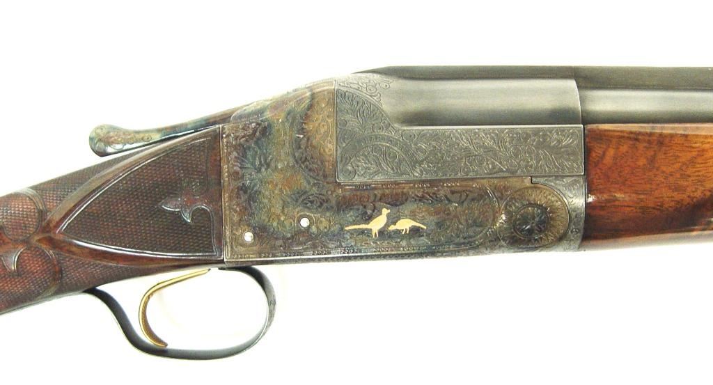 Ithaca 7E Single Barrel Trap shotgun in 12GA with 34” barrels, S/N 278826T showing deluxe engraving and gold inlays of eagles, elk, and game birds. First class restoration to fine condition. Measures 13 ½” to the end of the wood and 14 ½” to the end of the pad. Locks tight with fine bore. Choked Improved Modified. The engraving and inlay are exceptional as is the fancy stock and checkering. (C&R) Est.: $5,000-$10,000