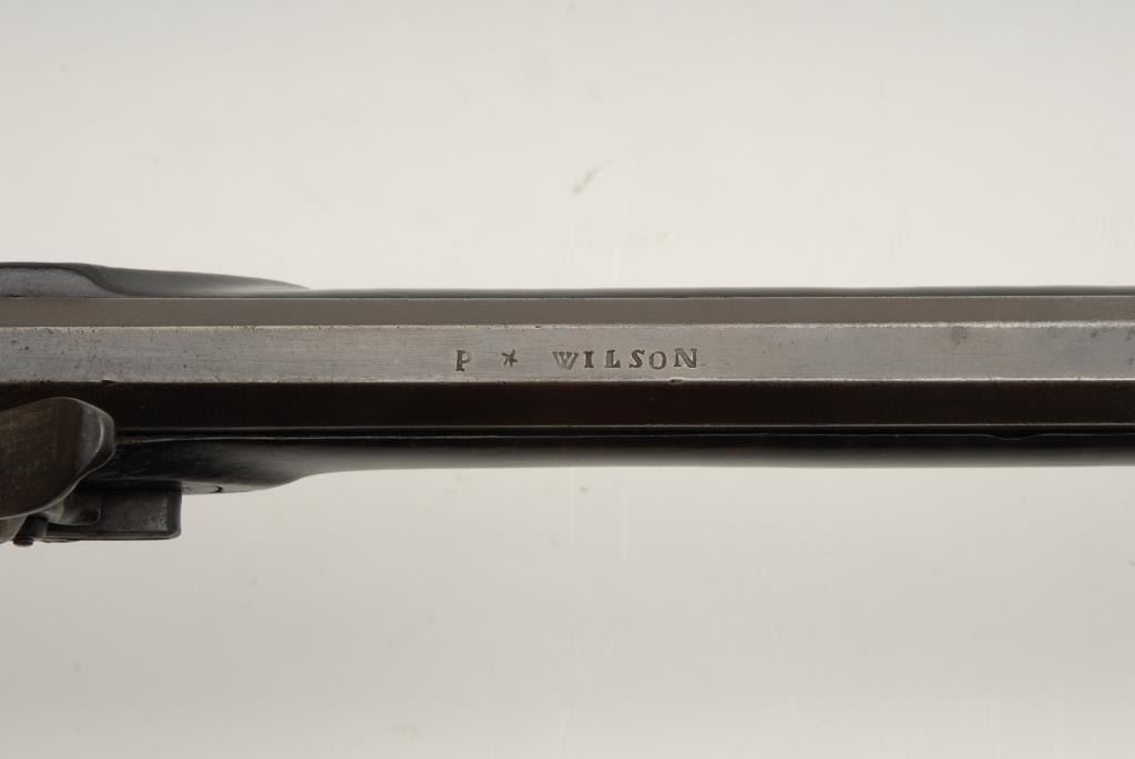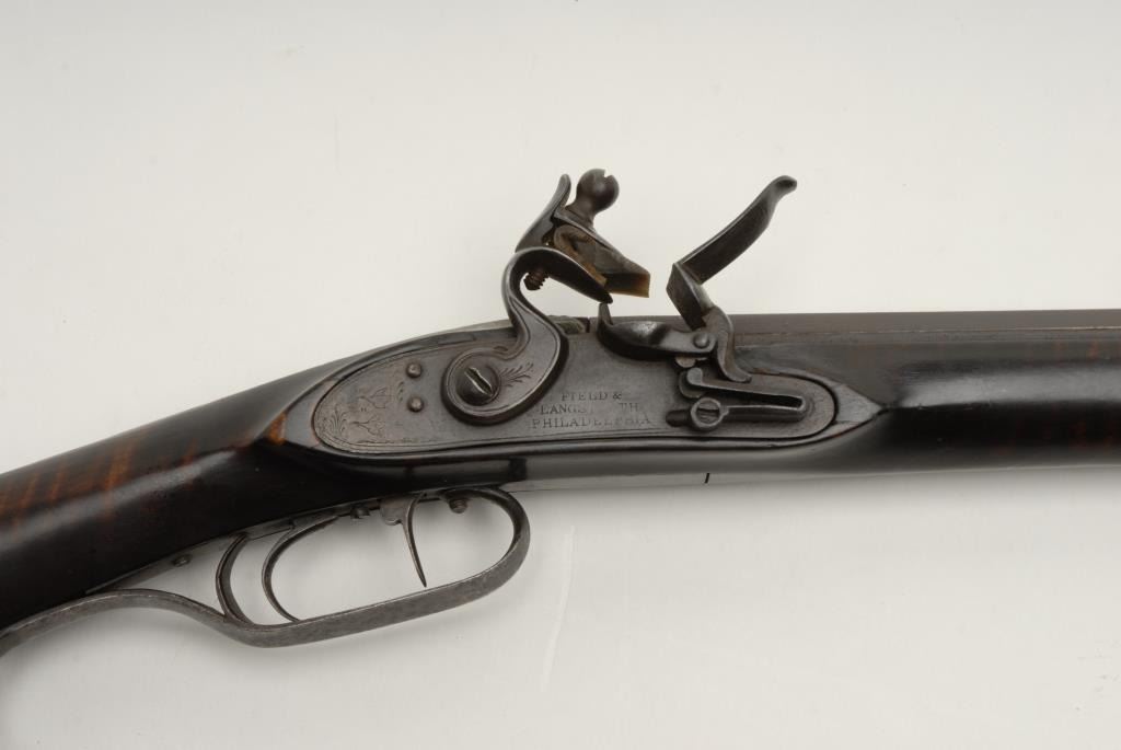 Beautiful flintlock Kentucky full stock rifle, .38 caliber, 46.5” octagon barrel signed “P. Wilson”, double set triggers, working at time of description, iron mounts and iron patchbox, lockplate marked “Field & Langstroth,Philadelphia”; original tiger striped wood full length stock. This fine piece shows classic architecture and is in overall untouched very good condition. There is an attached note to the trigger guard dated 1992, from noted expert W.B.Gusler, handwritten, stating “This rifle signed P. Wilson appears to be related to the Wilson family of Gunsmiths in Botetourt County, VA. (The patchbox) is related to Kinser, who worked in the adjacent Craig County, VA. The engraving behindthe rear sight is typical of Botetourt rifles and the filing of the rear ramrod pipe is related to signed John Wilson examples. The butt plate, stock architecture and barrel tang are more typical of Western Tenn. And N.C. I believe thepiece represents a maker that moved Southeast from Botetourt after his apprenticing”. A great piece of early American gun artistry! (Antique). Est.: $5,000-$10,000.