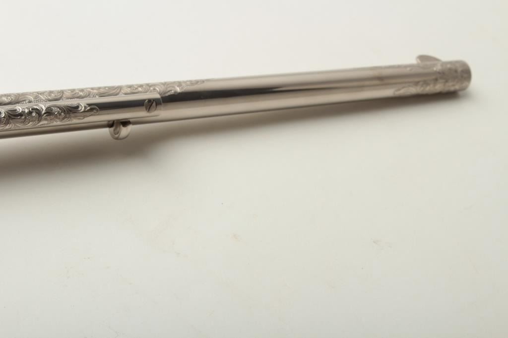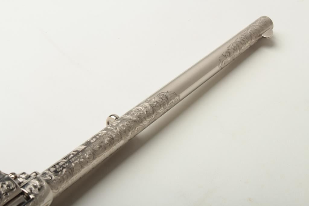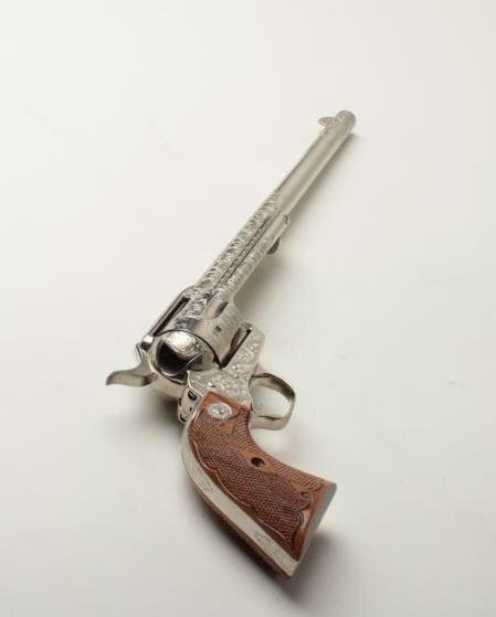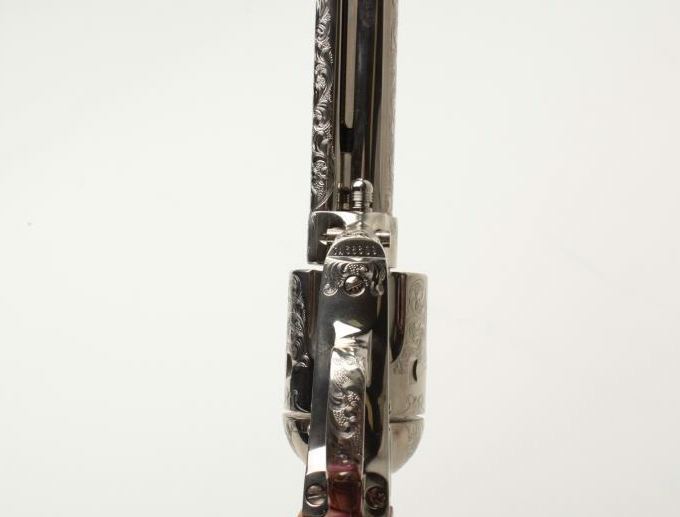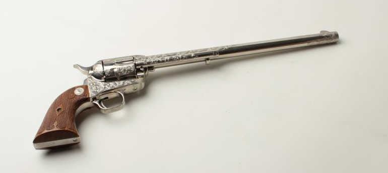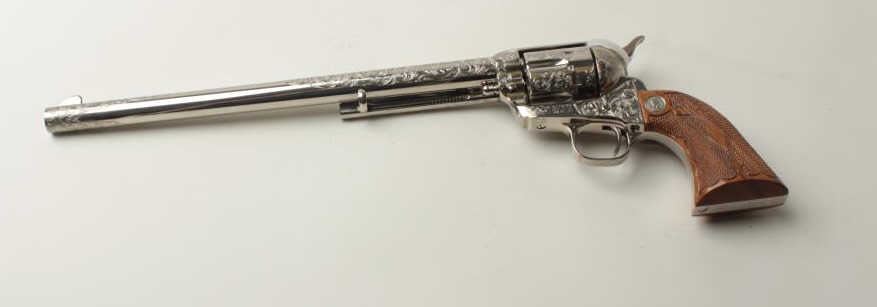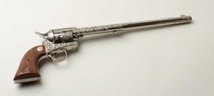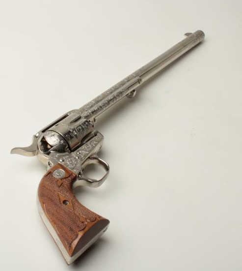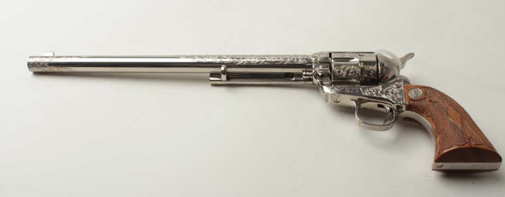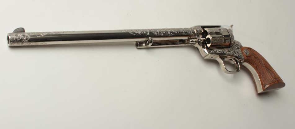Colt Single Action Army special ordered factory āDā engraved Lawman series in .44-40 caliber with 12ā barrel, nickel finish, deluxe checkered wood grips with nickel medallions, black powder 3 line patent dates, S/N SA68809. The label on the boxindicates C.S. (Custom Shop) order 2648 and 1 of 9. In excellent to mint condition in box with no firing and slight handling only. A very rare factory engraved Colt that was a display piece purchased by a major Colt collector more than 25years ago. (C&R) Est.: $4000-$8000