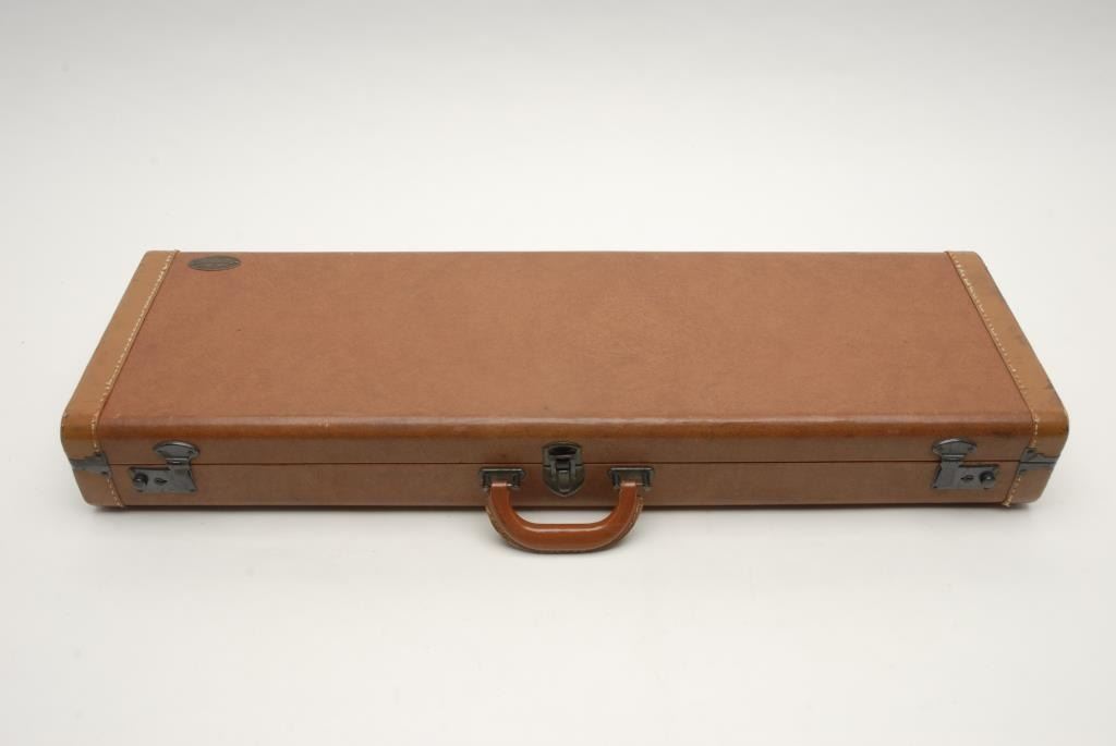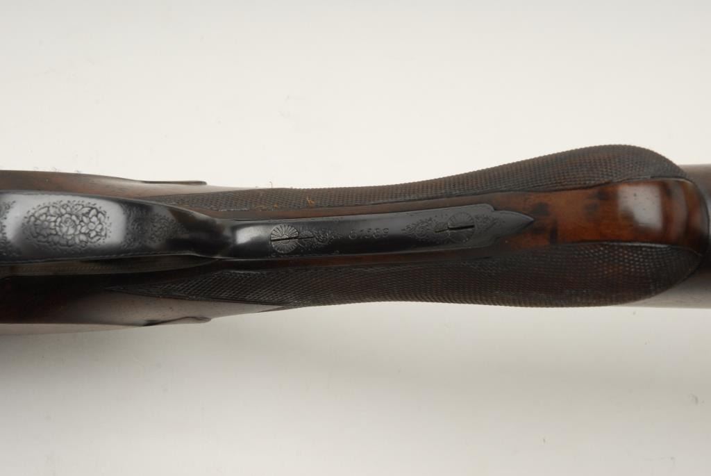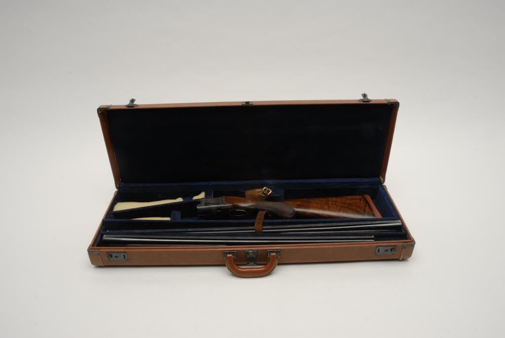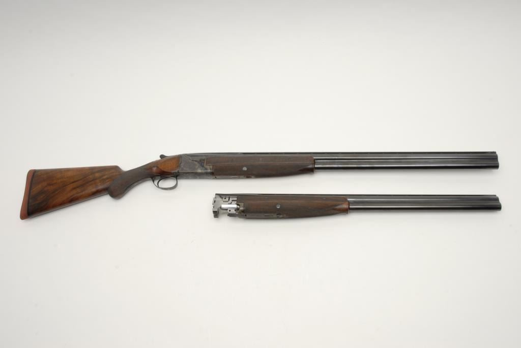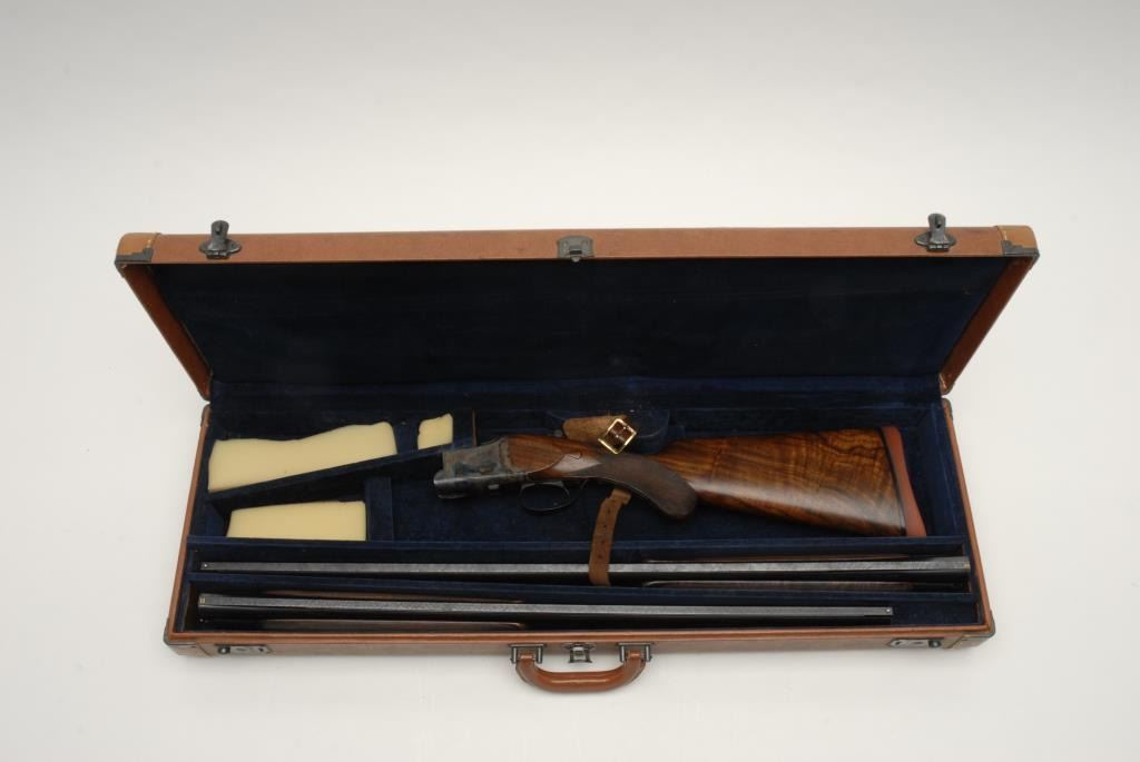 Browning B25 Custom Workshop Superposed 12GA shotgun with 2 barrels showing finest Belgium workmanship, blue and case hardened finish, deluxe figured wood stocks with two piece fancy checkered fore ends, fire polish and fit, singletrigger, auto ejectors, hand filed and matted ribs, SN: 81589. The #1 barrel is numbered with raised gold and measures 30” full and improved modified. The #2 barrel is also numbered in raised gold and measures 26 3/8” choked improvedmodified over improved cylinder. The stock measures 13 ½” to the end of the wood and 14 ¼” to the end of the pad. The gun shows a little firing and use and is 96%-98% retaining almost all original blue and case hardening. The stock showsselect grain and fine hand checkering with a satin finish also remains near fine. The markings are hand cut and not stamped which denotes the high degree of custom work on these seldom encountered special ordered arms. Estimated replacement costat today’s prices over $30,000 if it could even be ordered through Browning and Liege contracts. In a deluxe Browning case. (Modern) Est.: $9,000-$18,000