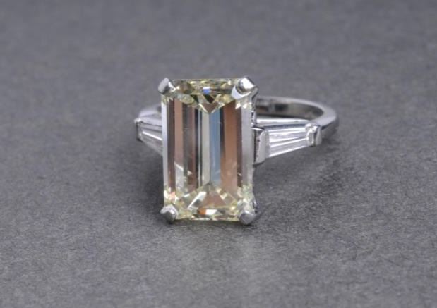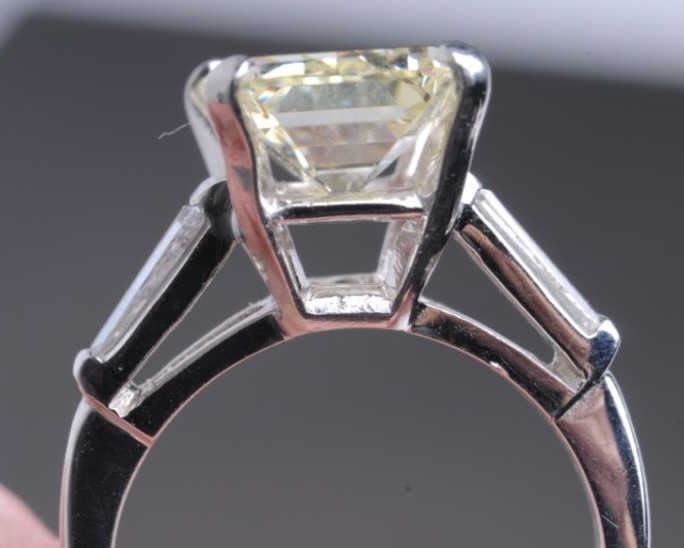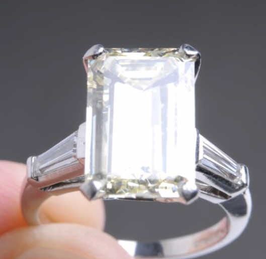 Ladies Platinum and Diamond Ring featuring one 5.08 ct Emerald cut Solitaire Diamond (est. weight-13.2mm by 8.45mm x 4.97mm) with two fancy tapered baguette accenting Diamonds of approx. 20pt each or .40 total. Newport Gem Labs-G.I.A,Certified Appraiser Debra Clark's Appraisal (datd 10-1-1979) included rating reports Diamond at VVS-2 to VS-1 and K Color, value of $69,000.00. From a Prominent Physician's Estate who's name is on this 35 yrs plus old appraisal.Est:$27,500-55,000.
