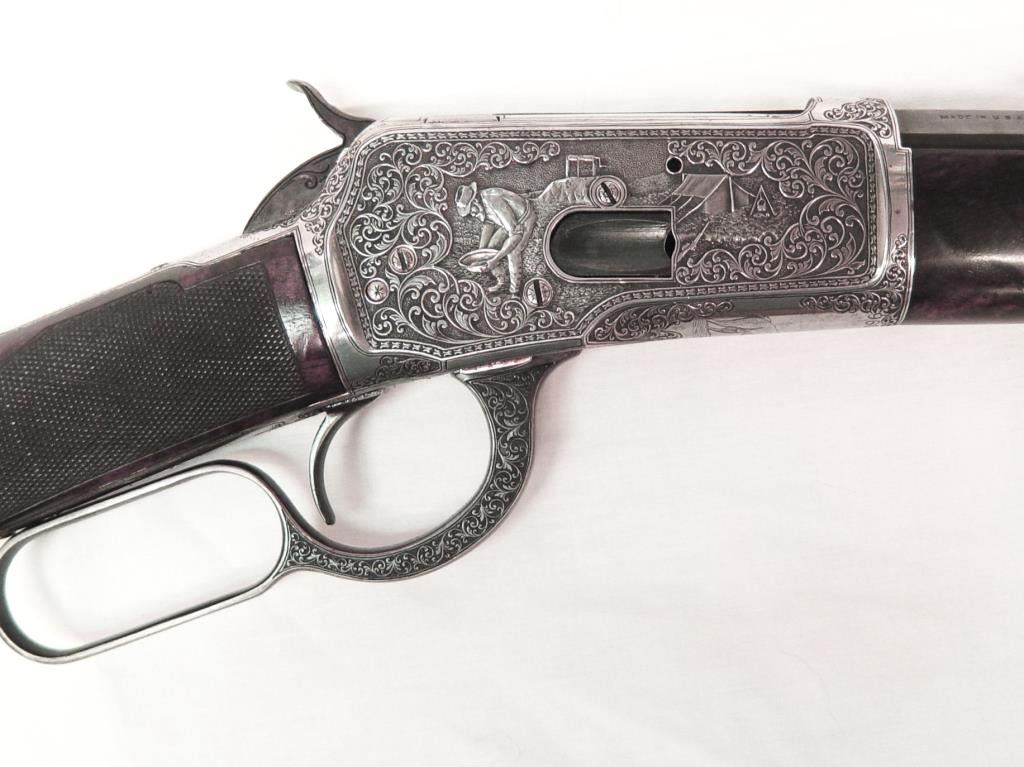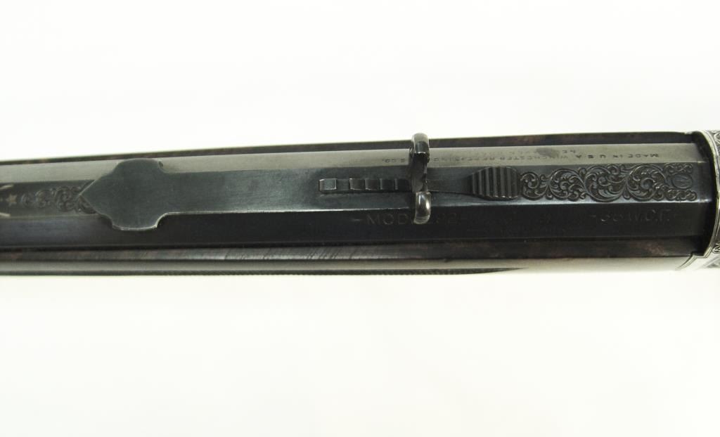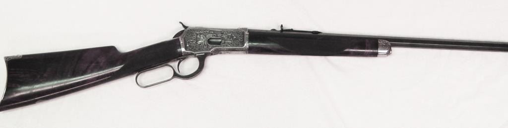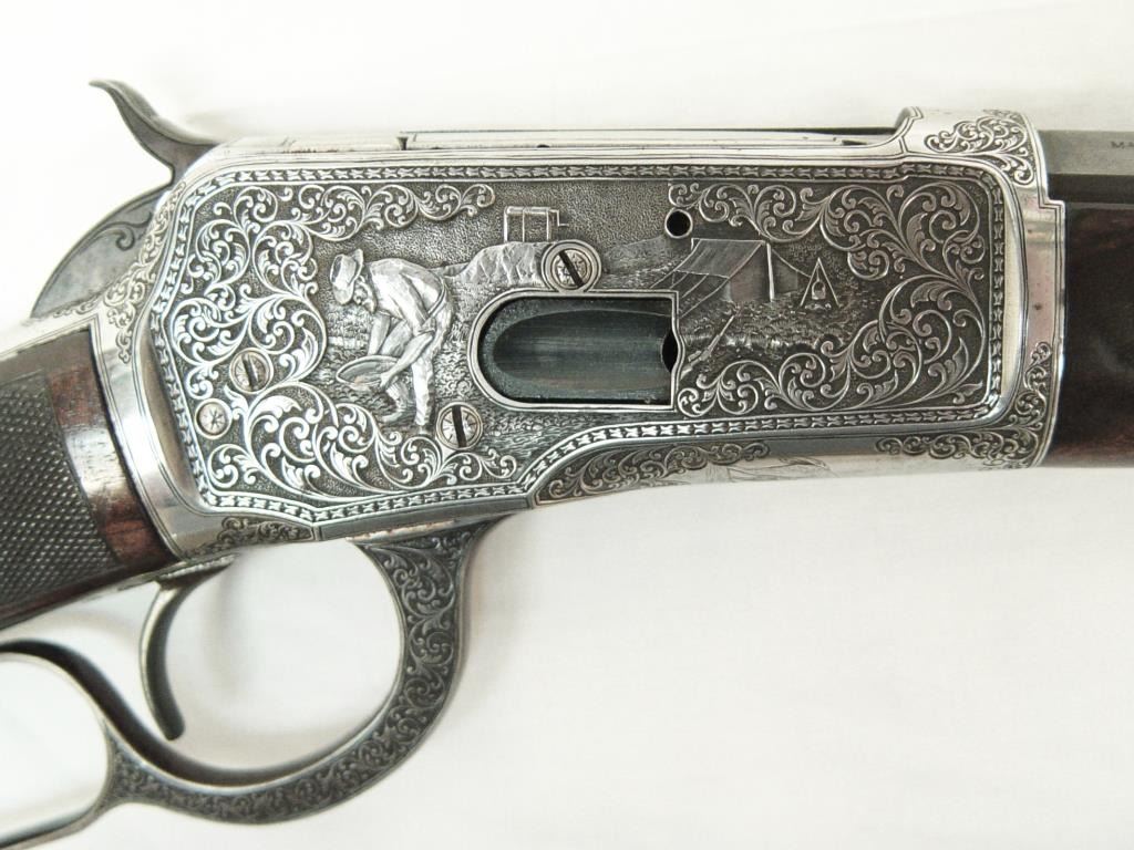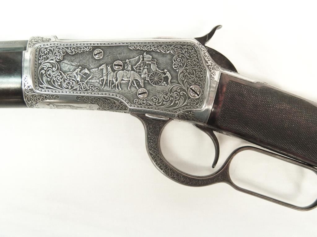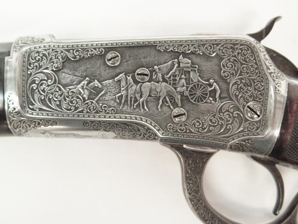 1892 Winchester Special Order rifle in .38-40 caliber with 24” octagon barrel, select checkered wood stock, and rifle butt. This rifle has been exhibition quality relief chiseled engraved in western scenes and is signed by Australian masterengraver R. Chapman. The left side of the frame shows a stagecoach and western scene surrounded by fine and tight scrolls. The right side shows a gold miner and camp scene. The barrel is engraved and fully silver inlaid. The rifle has beenrestored to excellent with the frame “In the White” to accent engraving. The action is very good and the bore is bright. S/N 960565. To replace this rifle would be an expensive and difficult project as there are only a handful oftop engravers that can deep cut and chisel in this precise manner. It is very similar to the master work of R. Kornbraith and Frank Hendriks. (C&R) Est.: $25,000-$50,000