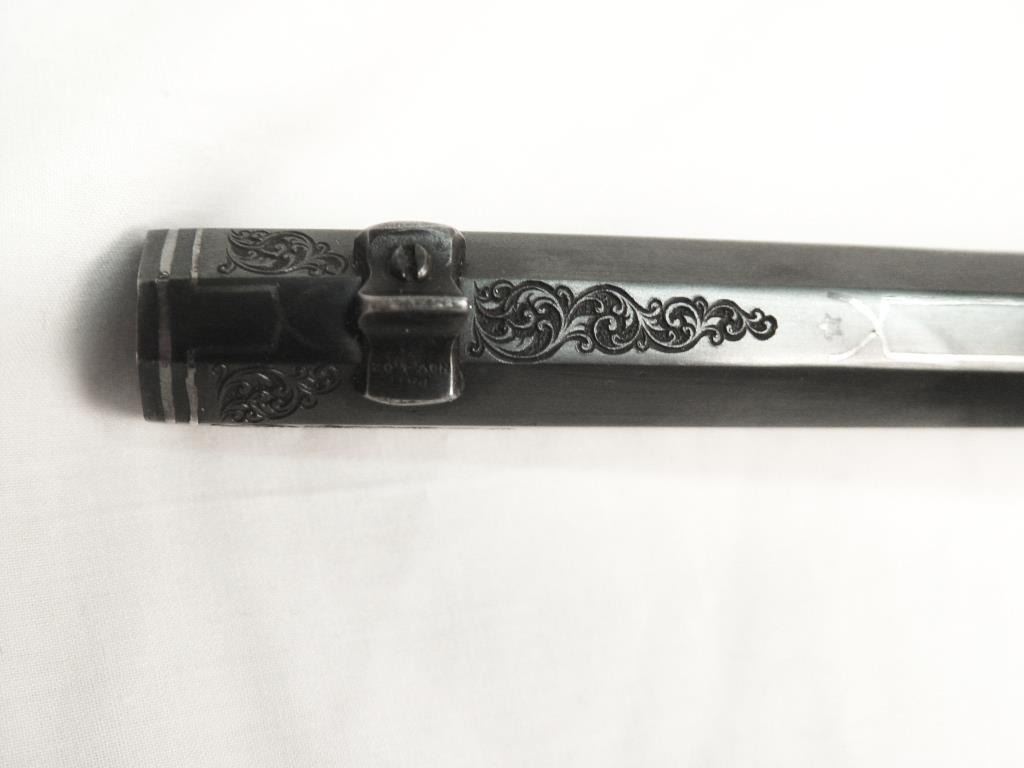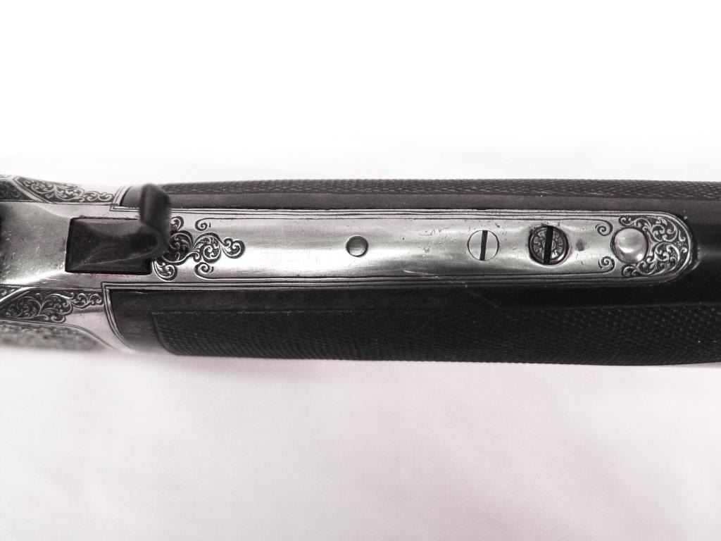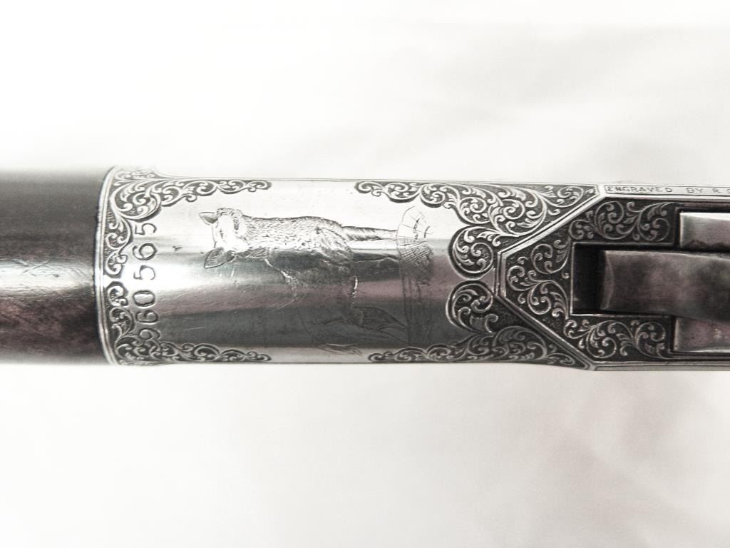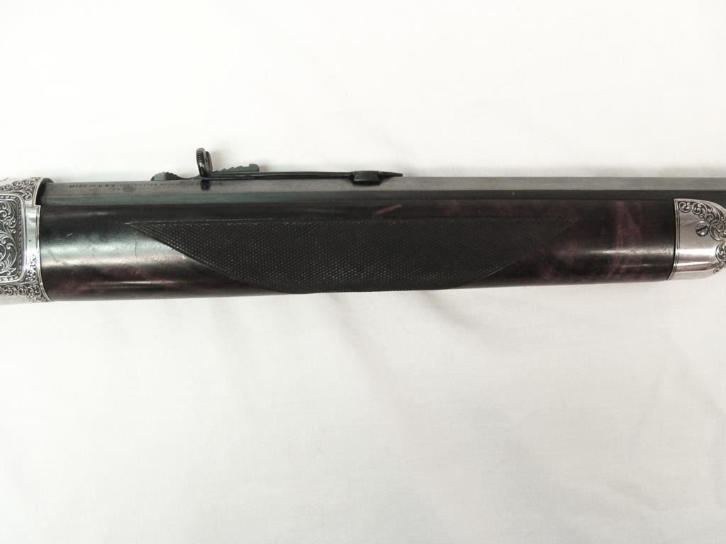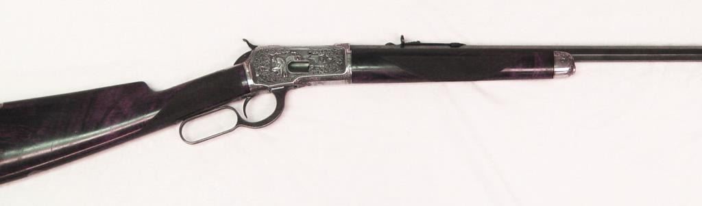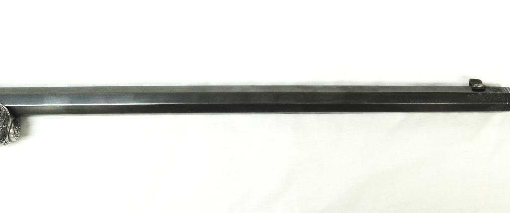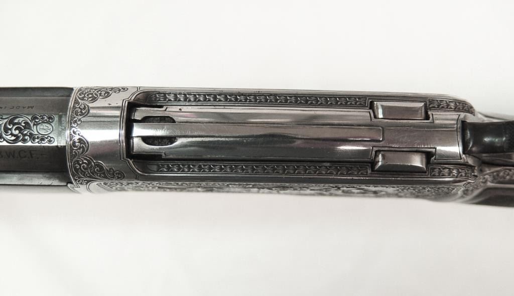 1892 Winchester Special Order rifle in .38-40 caliber with 24” octagon barrel, select checkered wood stock, and rifle butt. This rifle has been exhibition quality relief chiseled engraved in western scenes and is signed by Australian masterengraver R. Chapman. The left side of the frame shows a stagecoach and western scene surrounded by fine and tight scrolls. The right side shows a gold miner and camp scene. The barrel is engraved and fully silver inlaid. The rifle has beenrestored to excellent with the frame “In the White” to accent engraving. The action is very good and the bore is bright. S/N 960565. To replace this rifle would be an expensive and difficult project as there are only a handful oftop engravers that can deep cut and chisel in this precise manner. It is very similar to the master work of R. Kornbraith and Frank Hendriks. (C&R) Est.: $25,000-$50,000