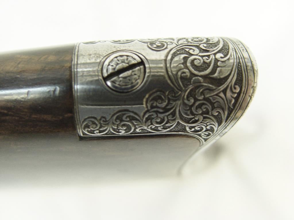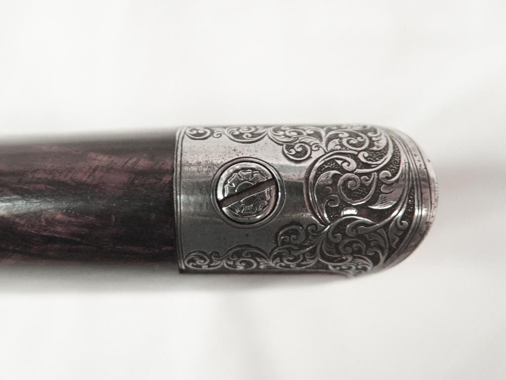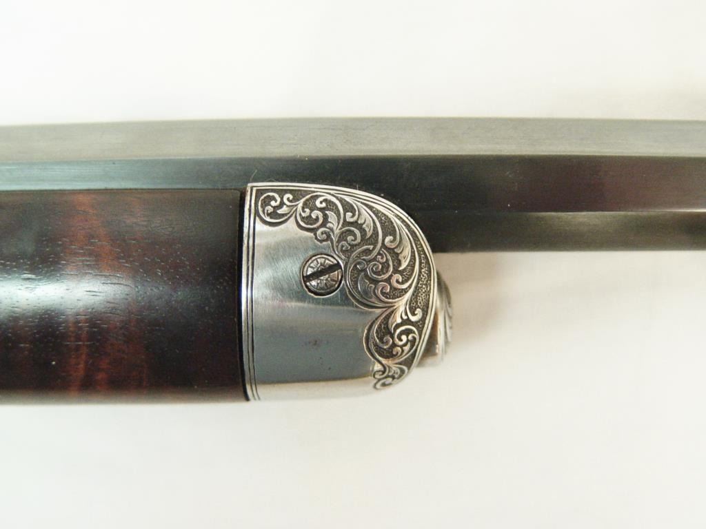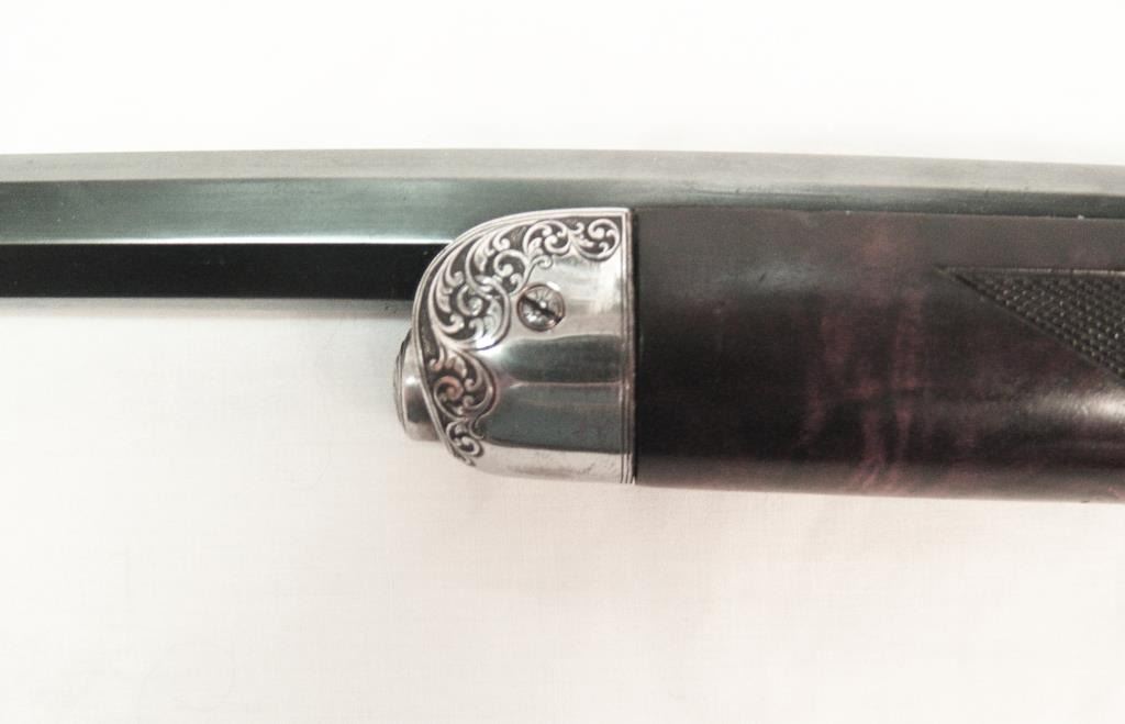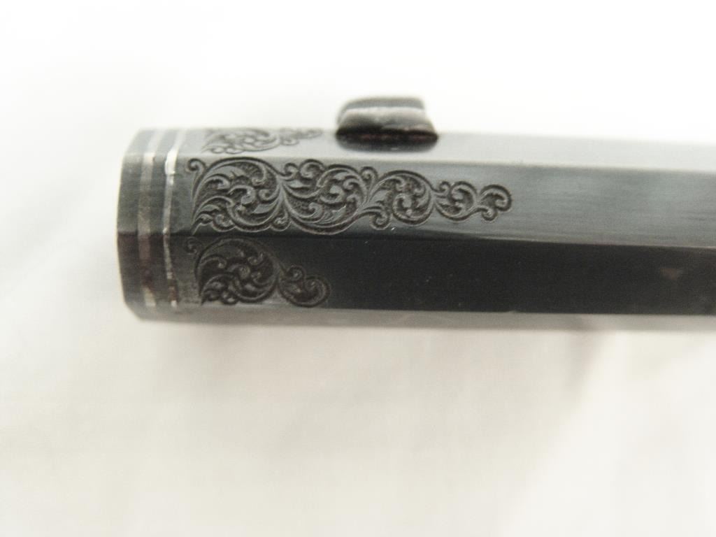 1892 Winchester Special Order rifle in .38-40 caliber with 24” octagon barrel, select checkered wood stock, and rifle butt. This rifle has been exhibition quality relief chiseled engraved in western scenes and is signed by Australian masterengraver R. Chapman. The left side of the frame shows a stagecoach and western scene surrounded by fine and tight scrolls. The right side shows a gold miner and camp scene. The barrel is engraved and fully silver inlaid. The rifle has beenrestored to excellent with the frame “In the White” to accent engraving. The action is very good and the bore is bright. S/N 960565. To replace this rifle would be an expensive and difficult project as there are only a handful oftop engravers that can deep cut and chisel in this precise manner. It is very similar to the master work of R. Kornbraith and Frank Hendriks. (C&R) Est.: $25,000-$50,000