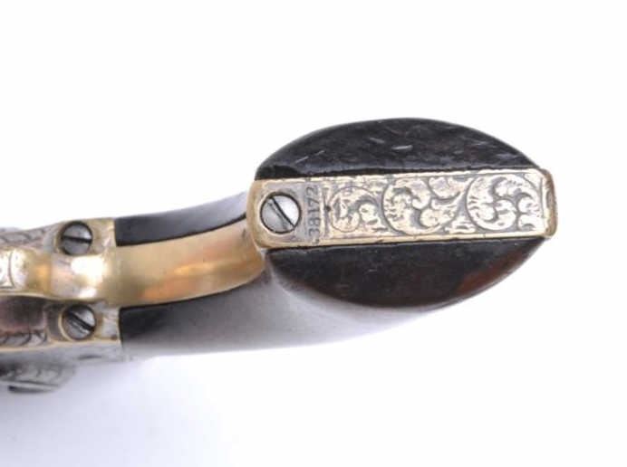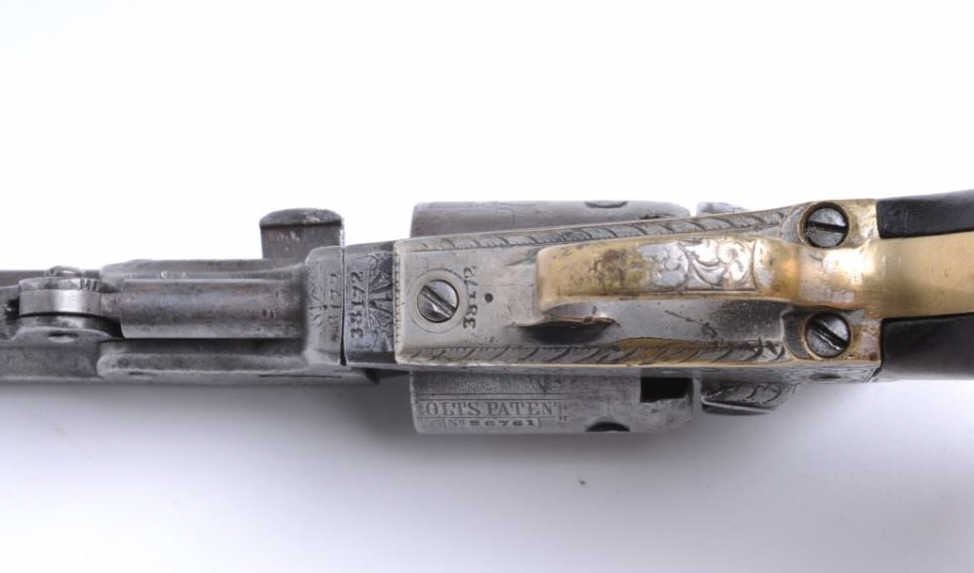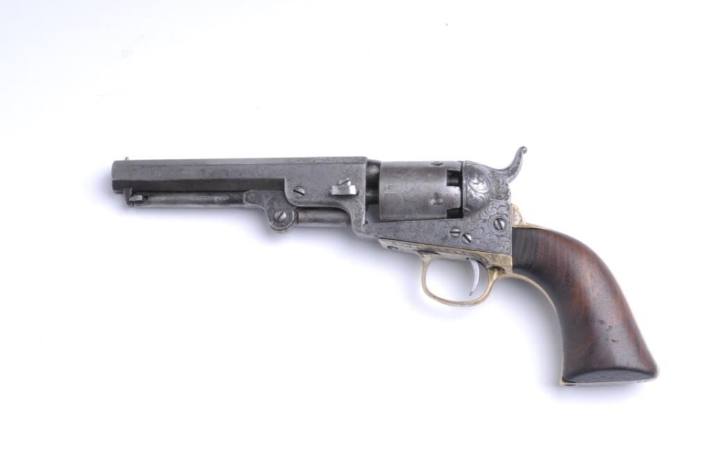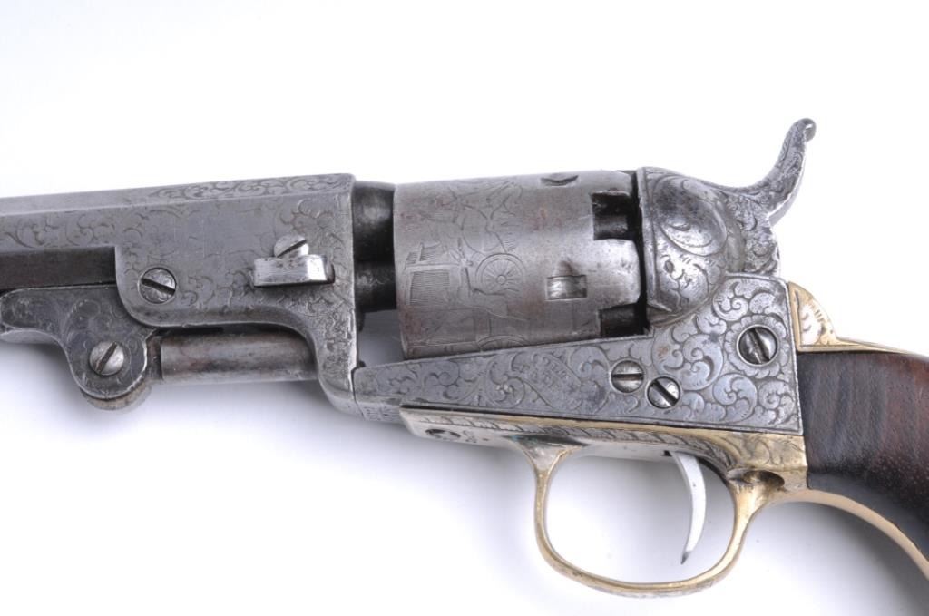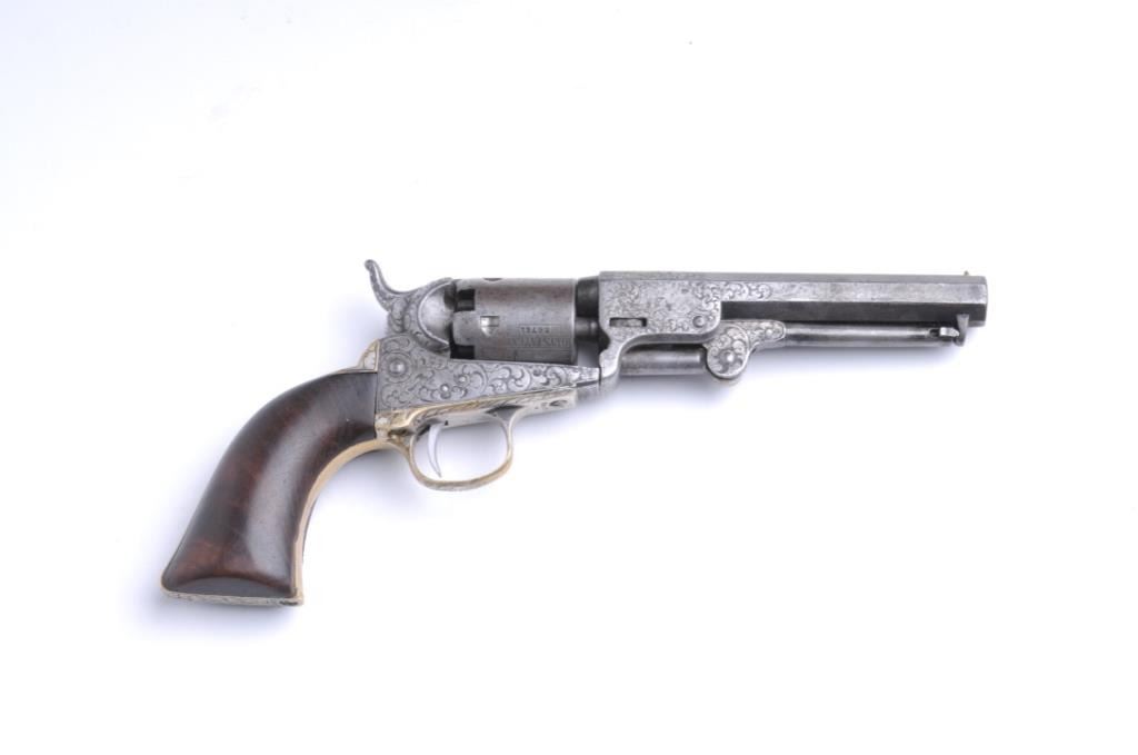Colt 1849 Pocket model fully period engraved in cloud scroll style with panel scene on each side of the barrel lugs, S/N 38172. Only a handful of deluxe engraved pocket models are known with panel scenes and this early “Cloud” motif. The barrelmeasures 5”, lightly cleaned gray patina finish with burl wood grips. The barrel shows “Sam’L Colt” in script with hand cut Colt’s patent in scroll on the left side of the frame. Approximately 50%-60% cylinder scene remains. Thegrips are also cleaned. About good overall with signs of use, carry, and small repairs. A minty panel scene pocket fetched over $200,000. (Antique) Est.: $3500-$7000