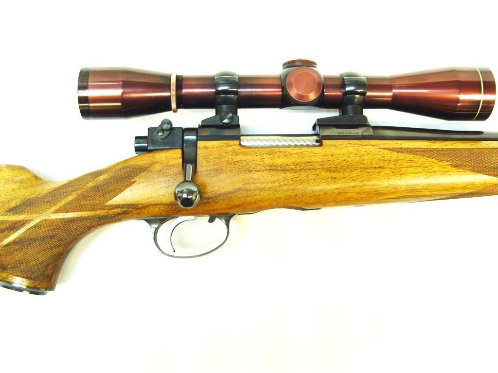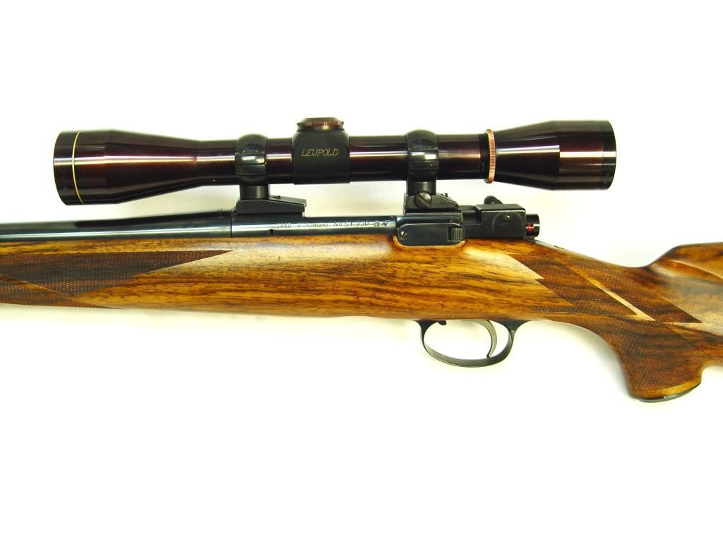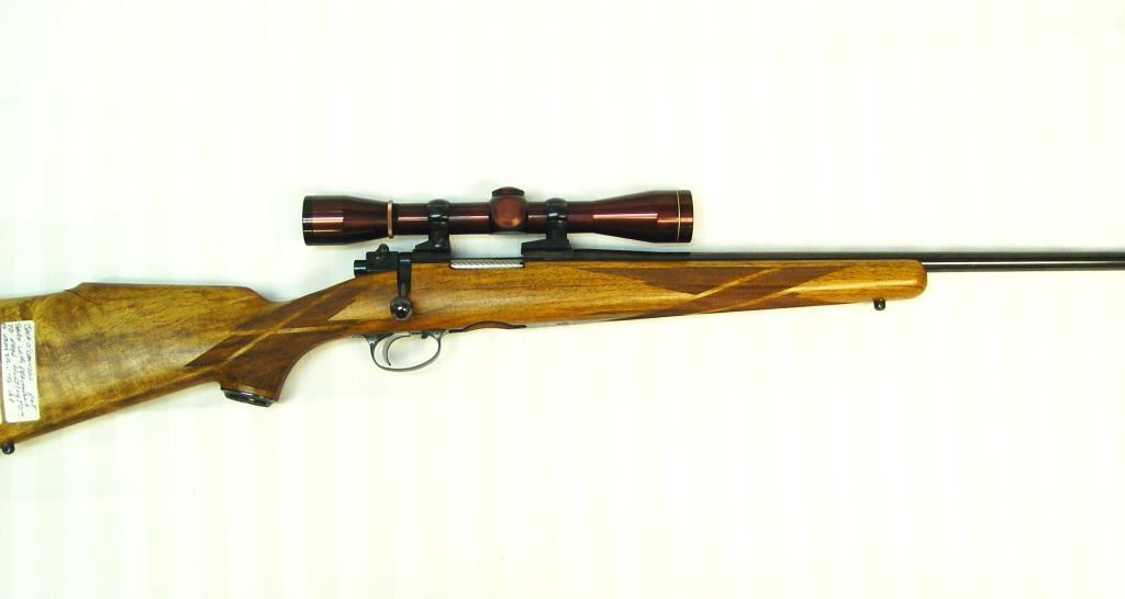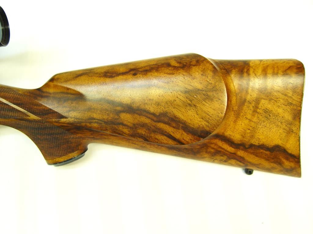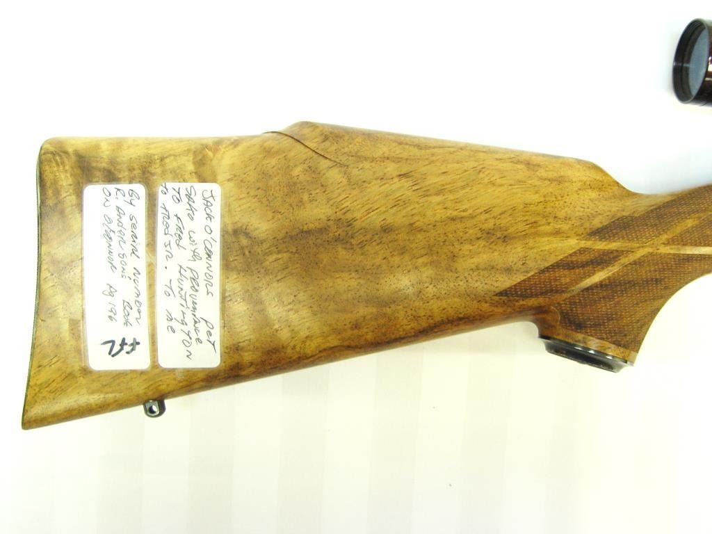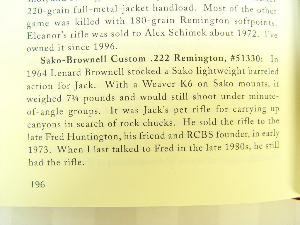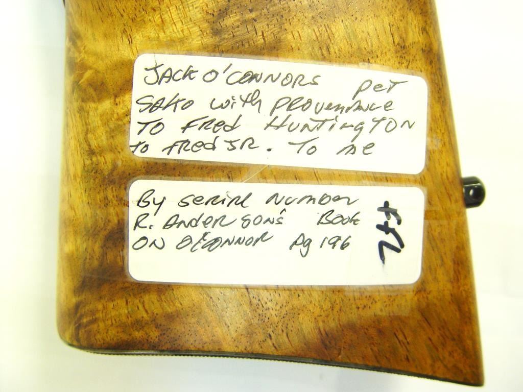Sako Ruhimaki Bolt Action Rifle in .222 Rem. Caliber. Custom stocked in 1964 by Leonard Brownell for legendry writer and rifle man Jack O’ Conner, S/N 51330. This rifle is mentioned and described in “Jacl O’ Connor, The Legendary Lifeof America’s Greatest Gun Writer” by Robert Anderson. The text describes this rifle as “Jack’s Pet” and the fact it was sold to Fred Huntington of R.C.B.S. The rifle shows a beautiful light colored burl stock with fancy and excellentaccomplished hand checkering milled butt plate and grip cap. Beautifully blued in rich royal color and accompanied by a Leupold scope. In fine to excellent condition as upgraded at the time of customization by Brownell who was considered among the best stock makers of the 1960s. A stock of this quality would be very expensive at today’s gunsmith rates and the history and provenance to O’ Conner is impeccable. Copy of the book is included. (C&R) Est.: $3000-$6000