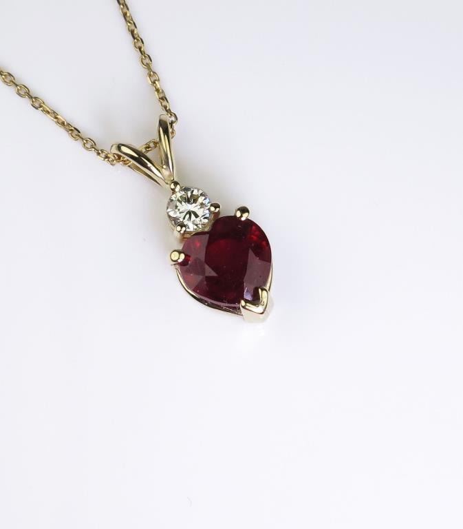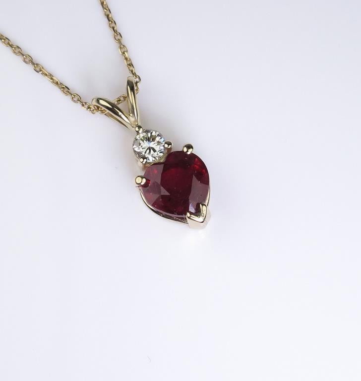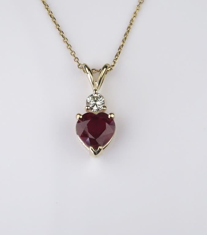 Elegant ladies neckpiece set with a center Heart shape Red Ruby weighing 3.03 carats and diamond accent weighing 0.28 carats of VS clarity H-I color set in 14 karat yellow gold custom setting. Retail $2,000-$3,000 Estimates $1,200 - $1,500