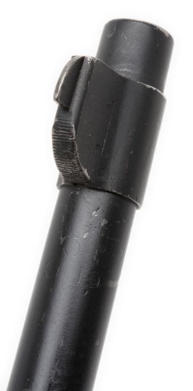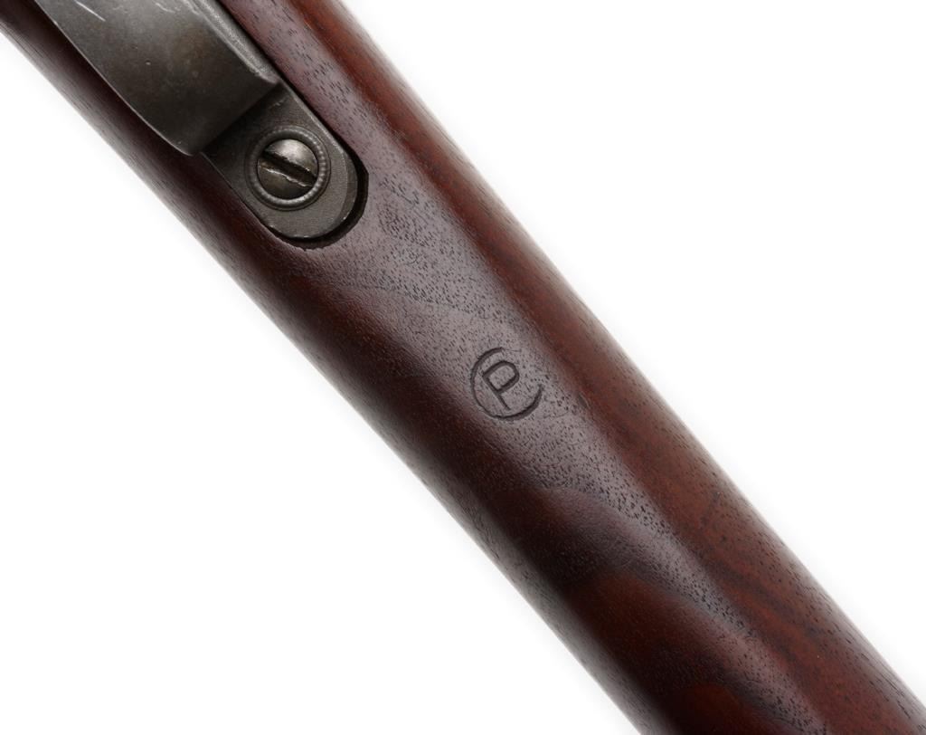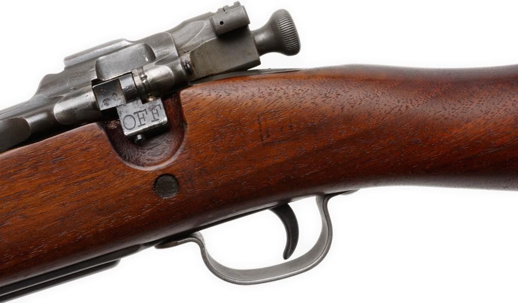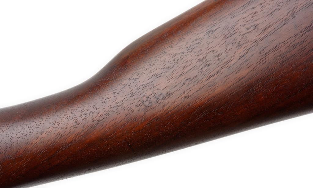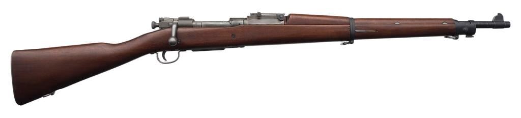 U.S. Rock Island Arsenal Model 1903 bolt action rifle, .30 caliber, S/N 303589. The rifle is in overall very good condition with a 24 1/2” barrel. The metal parts retain the majority of their military finish. While the barrel has the FlamingBomb proof dated 8-19 The smooth wood stock is in very good condition with “FJA”, crossed cannons and circle “P” cartouches evident. The stock shows small dents and compressions consistent with use. The rifle features original sling swivels,a tangent rear sight and metal butt plate with trap. The action is crisp, markings sharp and bore very good on this ’03. Est.: $1,250-$2,750.