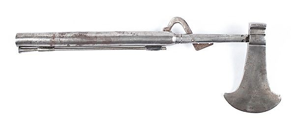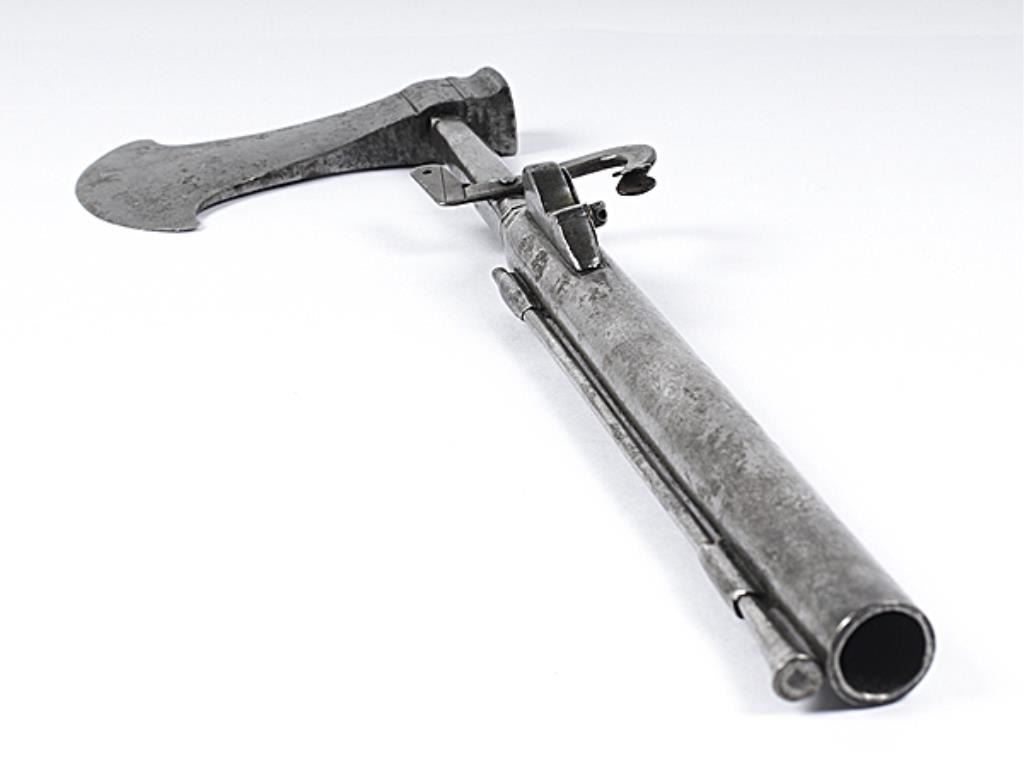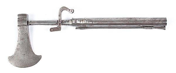 India Battle Axe And Match Lock, 5" iron head with 14" matchlock haft, 9.25" barrel with ramrod. Very good, bore is dark. Est:$500-700