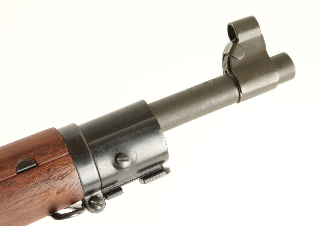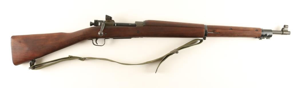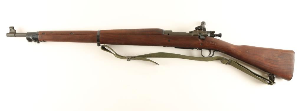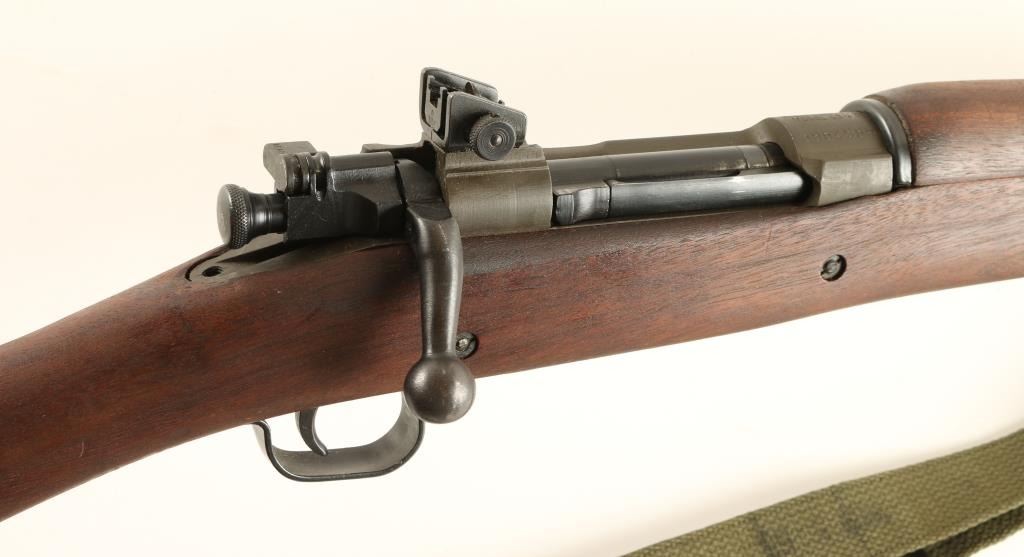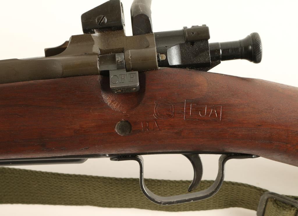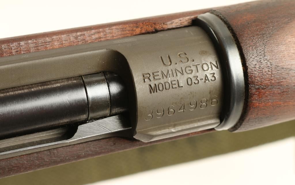 Minty Remington 03-A3 .30-06 S/N 3964986 U.S. Military contracted bolt action service rifle chambered in .30-06, circa 1943. Features a blued & parkerized finish, 24" barrel marked "RA (flaming bomb)5-43", raised blade front sight with cover, adjustable rear aperture sight, bayonet lug, two barrel bands, 5 round integral box magazine, green canvas sling, safety switch, trapdoor metal buttplate with cleaningkit, full-length walnut handguard and shoulder stock with circled "P", "RA", Crossed Cannons, "OG", & "FJA" cartouche. Rifle retains approximately 97% of it's arsenal refinish. Action is smooth, bore isexcellent, and wood stock is fine. Condition is excellent. ***C&R/MODERN EST:$700.00 - 1,400.00