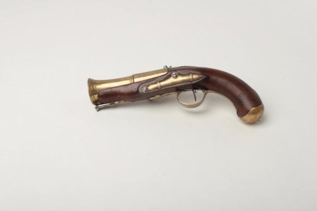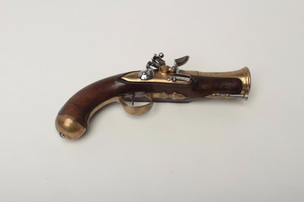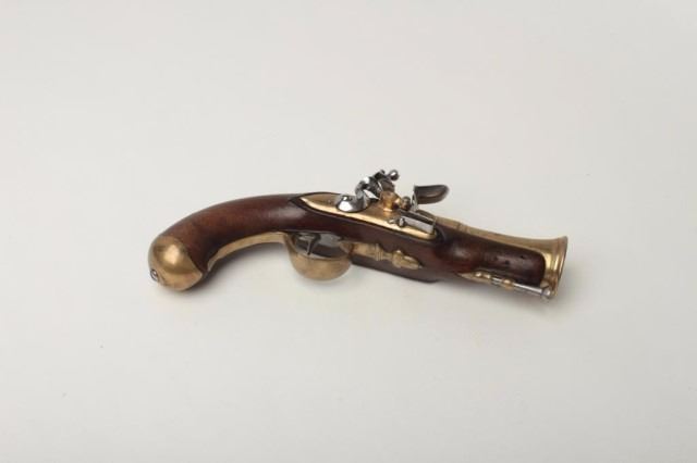 Lot 274 Flintlock Blunderbuss Pistol 1 3/8" bore diameter at flared muzzle, 4.25" round barrel. No markings