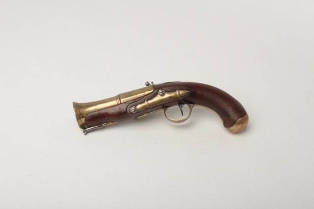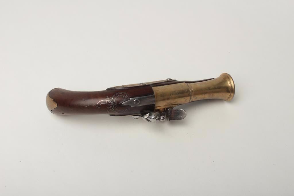 Flintlock Blunderbuss Pistol 1 3/8" bore diameter at flared muzzle, 4.25" round barrel. No markings on barrel or lock, Walnut stock with silver wire inlay around upper tang. With steel ramrod with two brass ferrules, acorn finial brasstriggerguard, brass buttcap and brass sideplate. All parts appear to have been cleaned and are bright. The stock has some minor age cracks at the forend. The mechanics are excellent. Est:$750-1,500