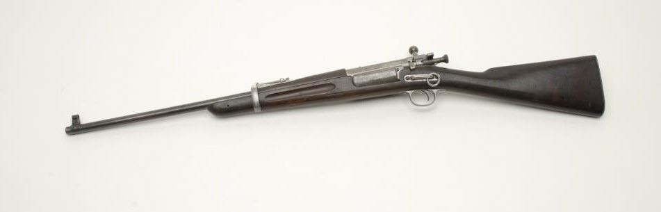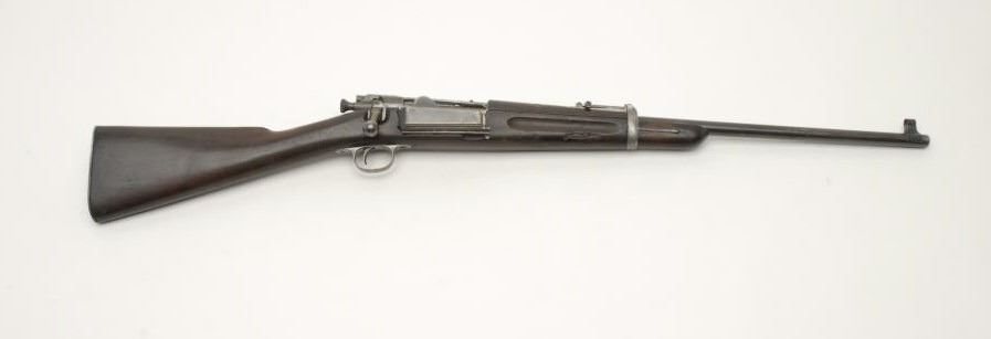 U.S. Springfield Model 1896 Krag bolt action SRC, .30-40 Krag caliber, 22” barrel, military finish, S/N 72317, some military finish remaining, mostly on barrel, rest gone to patina; in overall good condition with a good bore, crisp action, goodmarkings, wood shows normal wear from cavalry use; small crack behind side plate; cartouche of “JSA/1897”; faint “P” proof. (C&R). Est.: $900-$1,800.