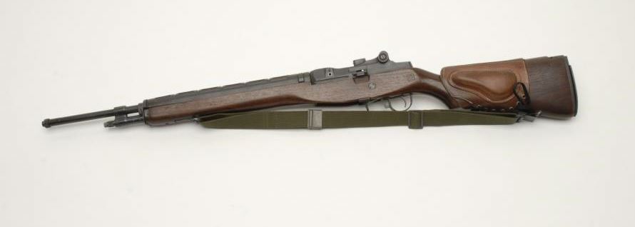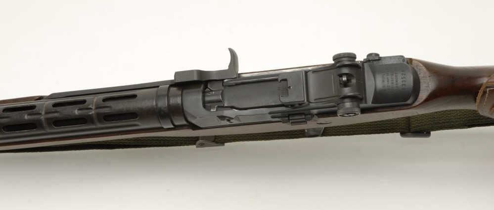 U.S. M1-A semi-automatic rifle, .7.62mm caliber, un-marked barrel, commercial military type finish, S/N 033529, excellent bore, crisp action, sharp markings, very good military surplus stock with eagle cartouche and leather cheek piece; olivegreen woven sling. (Modern). Est.: $900-$1,800.