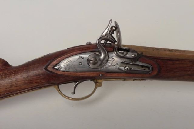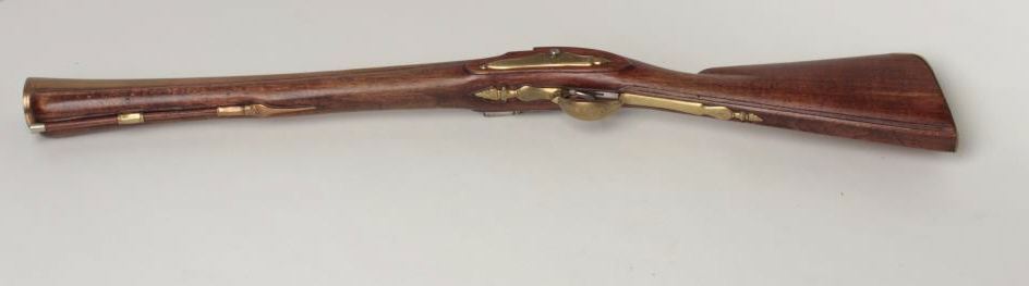 Belgian Flintlock Blunderbuss 1 5/8" bore diameter at flared muzzle, 19 3/8" round to octagonal brass barrel. The barrel is stamped 104 and Made in Belgium. The flat areas of the octagonal portion feature detailed scroll and floralengravings. The lockplate also features scroll and floral engravings, as does the brass triggerguard. The walnut stock has a German silver tipped ramrod, with brass ferrules, butt plate with engraved finial and an inlaid brass plaque at the wrist. Excellent overall condition. The blunderbuss is of newer construction. Est:$700-900