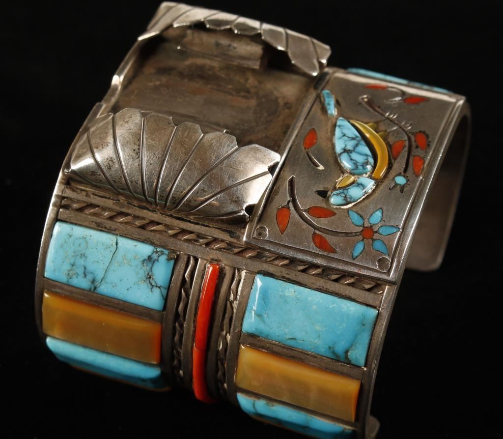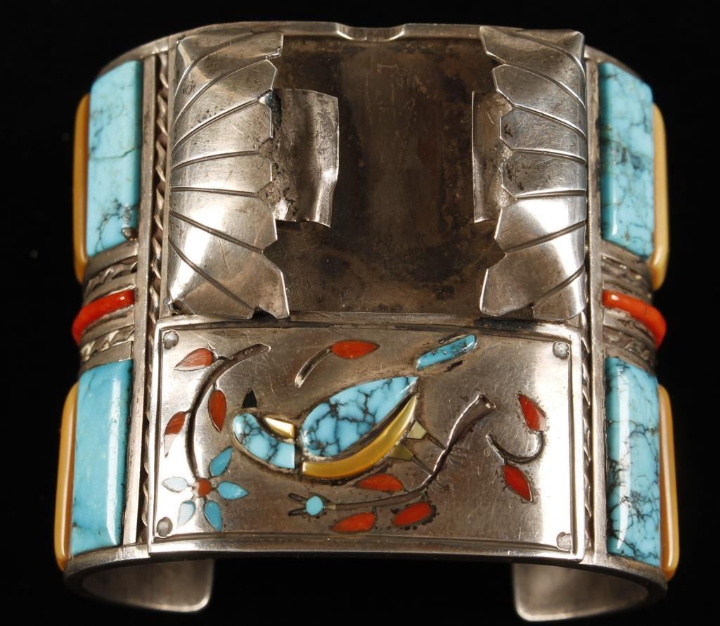 Lot 299 Zuni Cuff with inlaid bird signed W. Silvers, beautiful Turquoise, accented with Coral and Pearl,