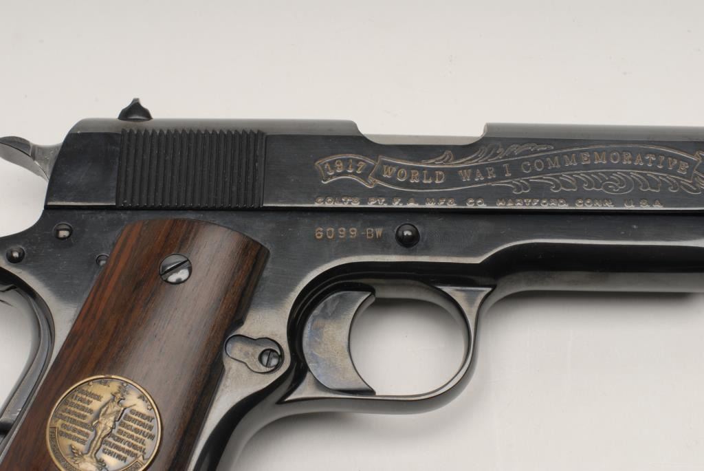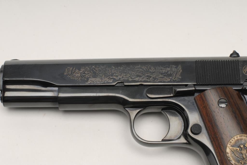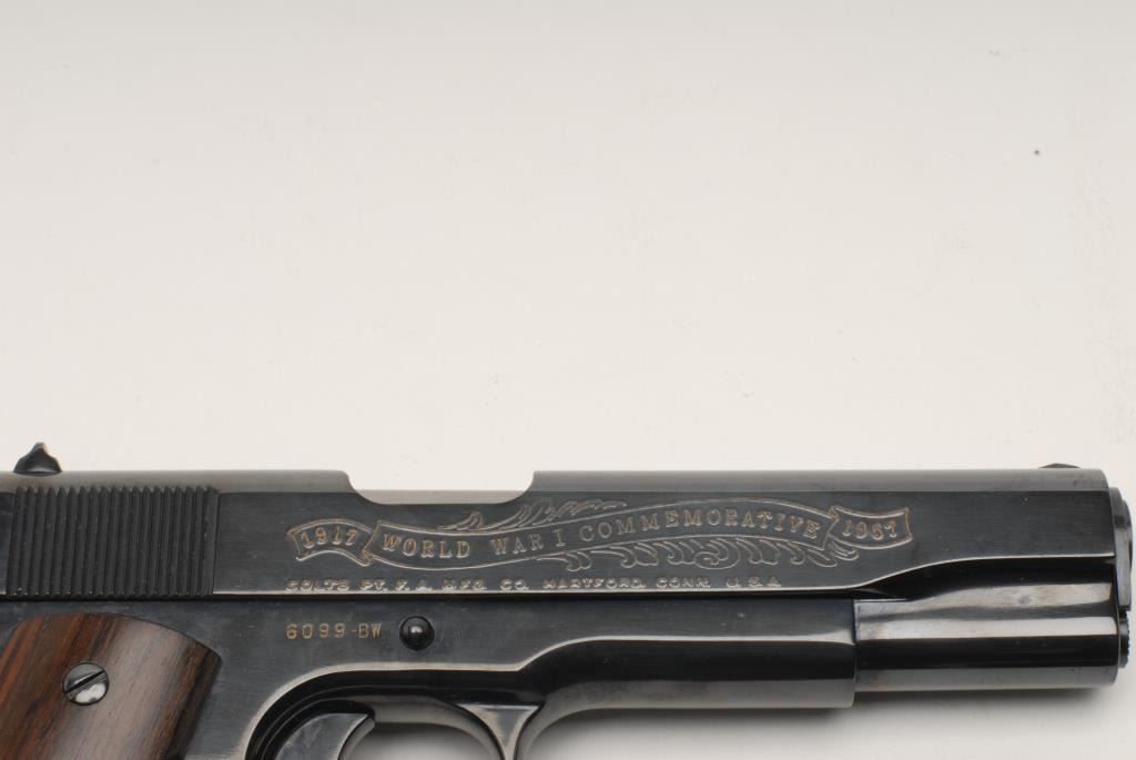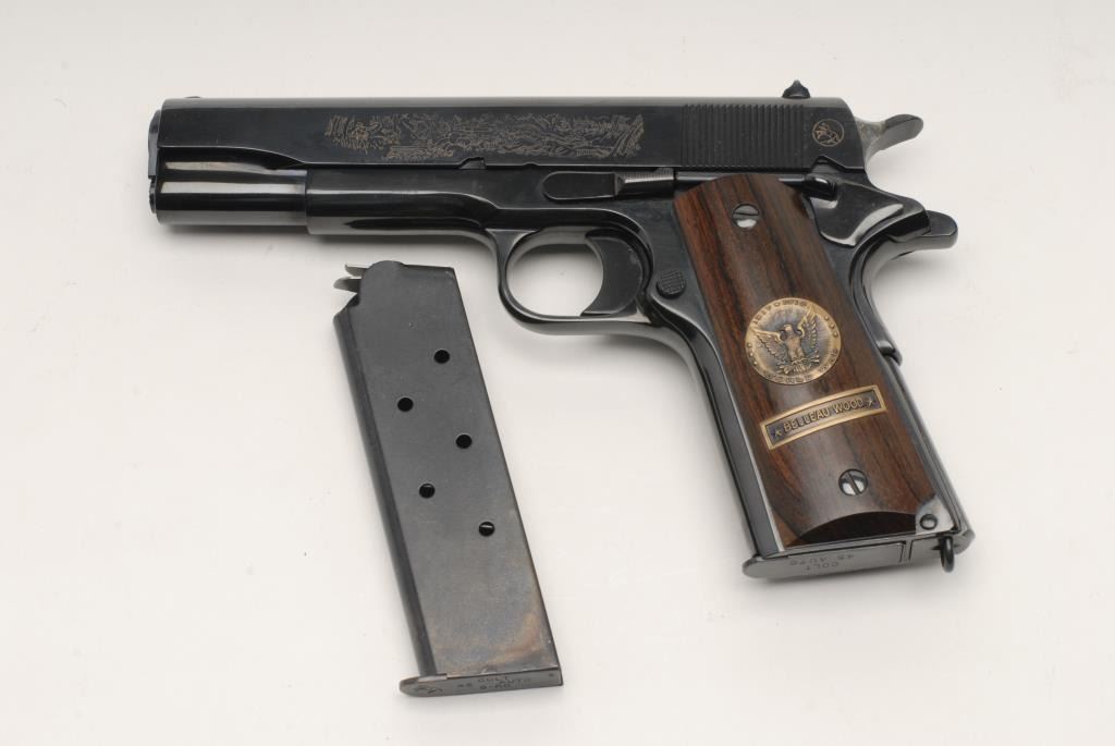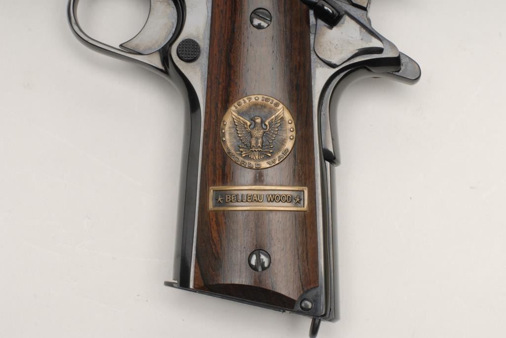 Colt WW I Battle of Belleau Wood Commemorative Model 1911 semi-automatic pistol in kraft cardboard box with instructions and one modern extra magazine, .45 caliber, 5” barrel, blued finish with commemorative ornamentation, woodgrips , S/N 6099-BW in like new condition. (C&R/PPT). Est.: $600-$1,200.