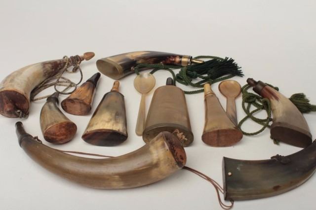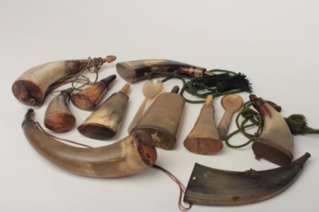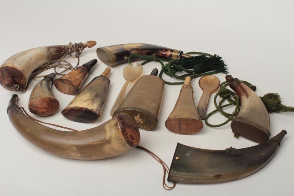 Large Lot of Powder Horns, Flasks, Priming Horns and More Includes two full size plain powder horns with wood bases, six flat flasks, two have green cords, two priming horns and two horn spoons. Good. Moderate wear and age toning.Est:$600-1,200