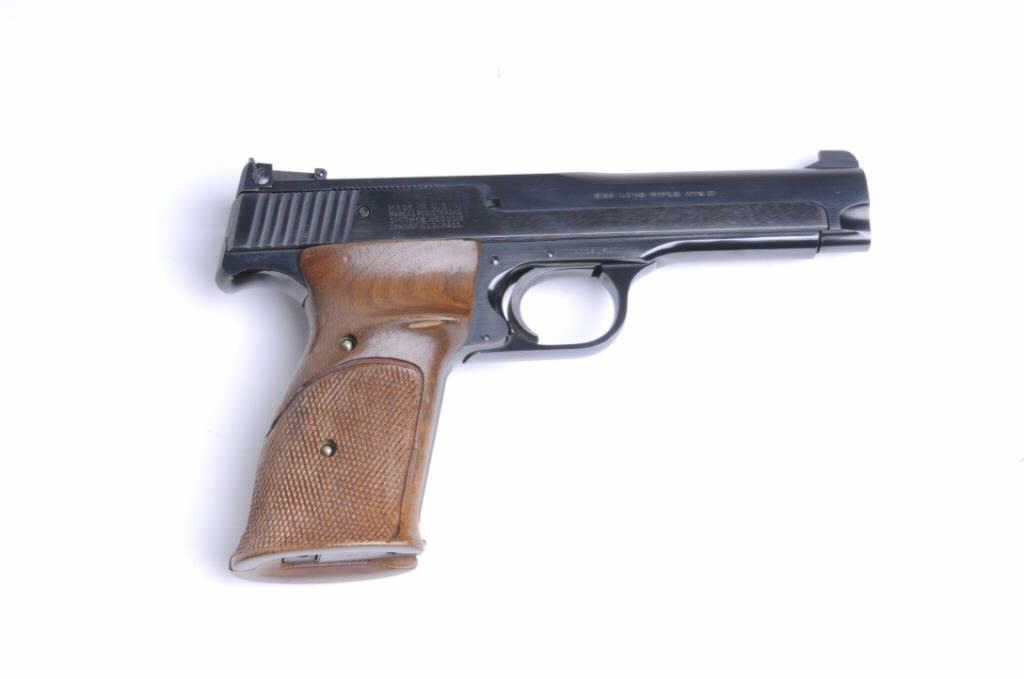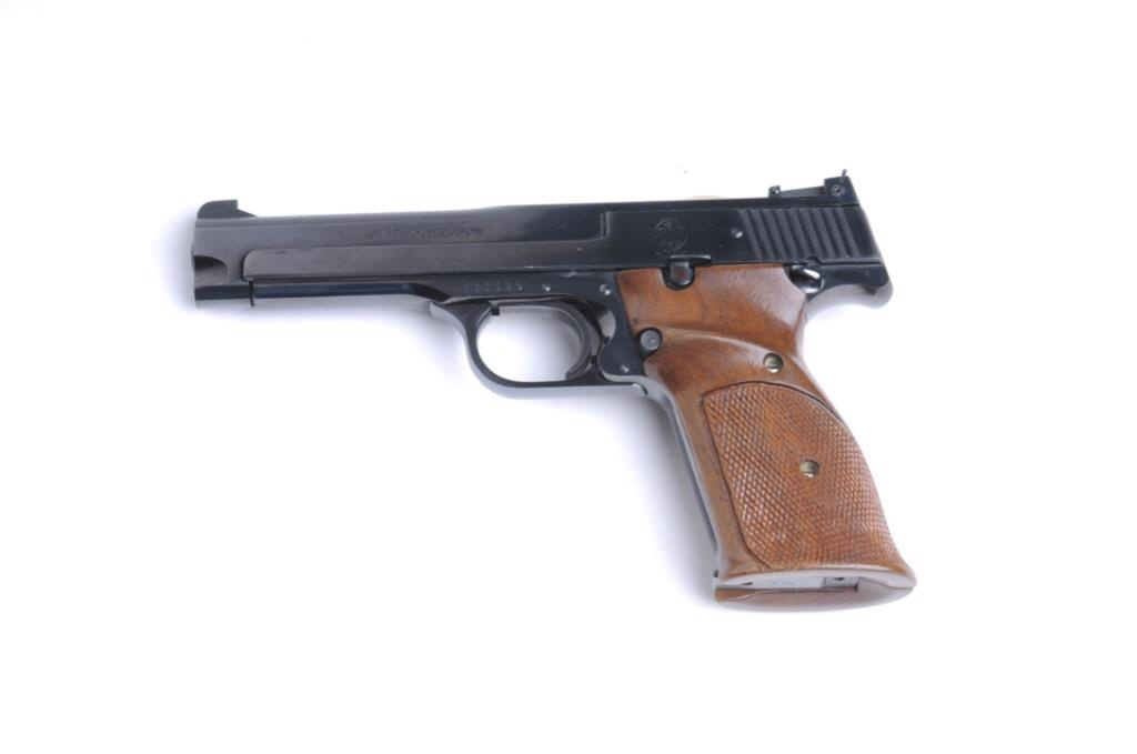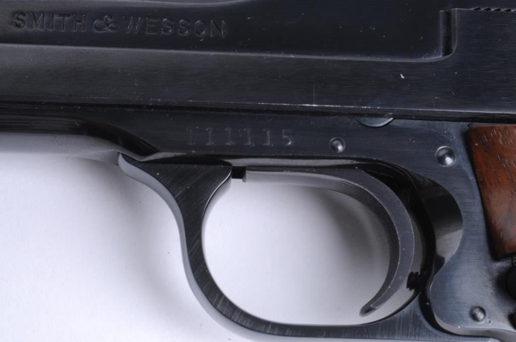S&W Model 41, # 111115, 22 LR, semi automatic target pistol, checkered wood thumb rest grips, 5” “slab” barrel, adjustable sights. Excellent example of an early model 41, retaining 99% of the original blue finish and in fine condition. Onemag. Est. $600-1,200.