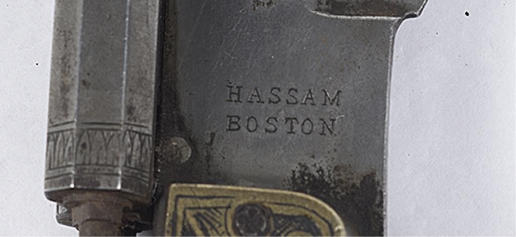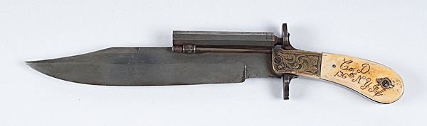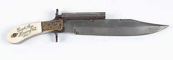 Contemporary Percussion Knife Pistol, .340 bore diameter, 2.75" barrel length, 8.5" clip point blade, 13" overall length. Markings on the ricasso Hassam over Boston. Engraved barrel and scroll engraved brass bolster. Bone handle withmarkings on the left side Co. D over 136th N.Y. Inf.. Right side marked Capt Aug. Harrington 1862. The blade and barrel have a silvery gray patina mixing with salt and pepper pitting. The brass has a nice mustard patina. The bone handlehas a yellowing patina. Mechanically good. Est:$300-500