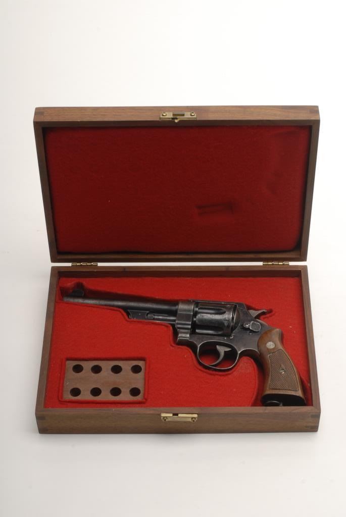 Smith & Wesson New Century “Triple Lock” DA revolver, .455 caliber, no visible British proofs; 6.5” barrel, S/N re-stamped in crane and on back of cylinder “6272”; lanyard ring, later era checkered S&W wood medallion grips; overall goodcondition with areas of original blue finish remaining mixed with scattered erosion spots; good bore, action and barrel address; good replacement grips; accompanied by a lined wood presentation case. (C&R/PPT). Est.: $300-$600.