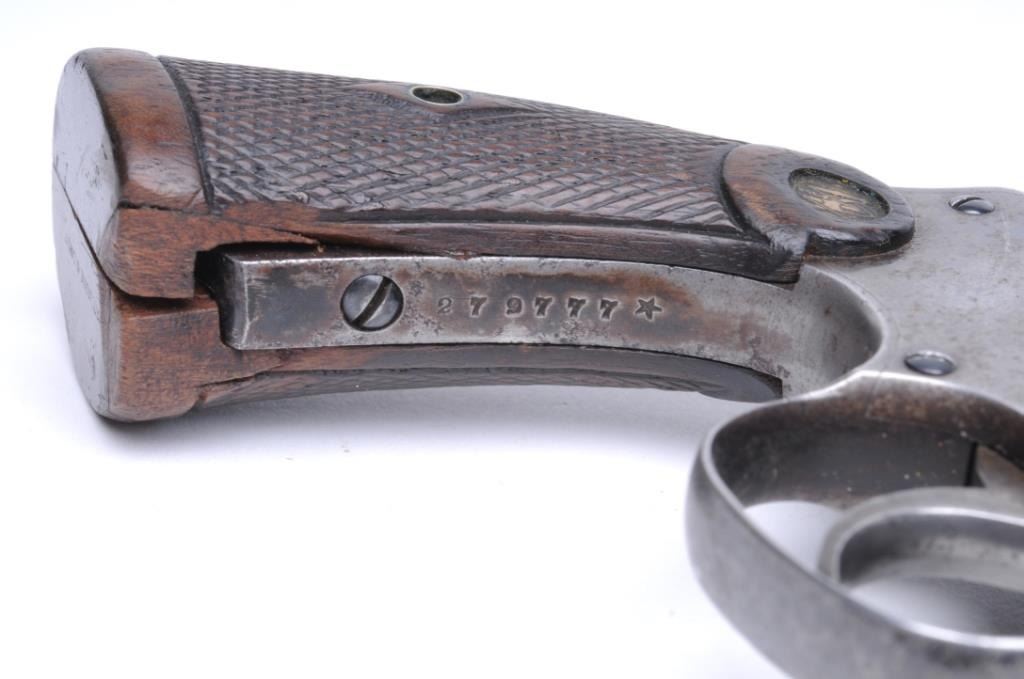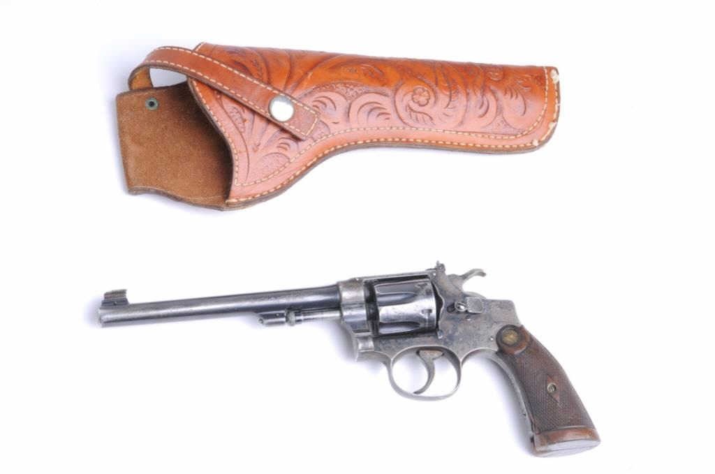 SMITH & WESSON Bekeart Model Revolver, #27977, .22 cal., 6” barrel, blued finish, adjustable sights, checkered wood grips with medallion. Good condition overall, with approximately 50% of the original finish remaining, mainly on the barrel.Minor pitting on the right side of the frame, one of the flutes on the cylinder has slight gouges. Grips are fair, and show a crude repair under the backstrap. Includes a leather holster. Est. $250-500.