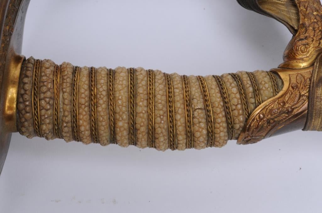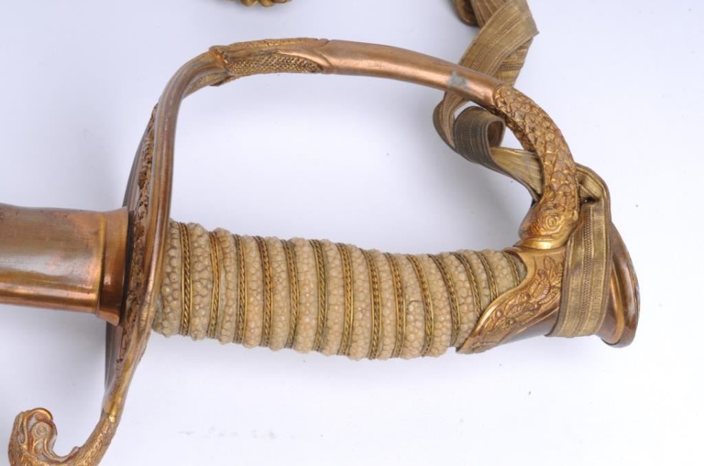 U.S. Coast Guard sword and brass mounted leather scabbard by McLilley & Co., Columbus, Ohio, in overall very good to near fine condition showing crisp etching on the blade, wire wrapped rayskin grip with fancy brass cast handguard and pommelshowing traces of gold wash in protected areas. Scabbard is in very good to near fine condition with some minor spots of wear and beautiful patina to brass mounts; accompanied by hang cord and knot. Est.: $300-$600.