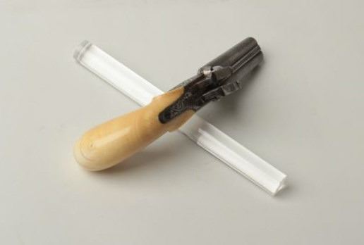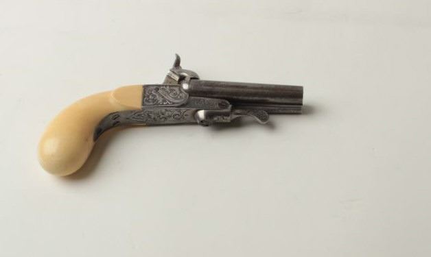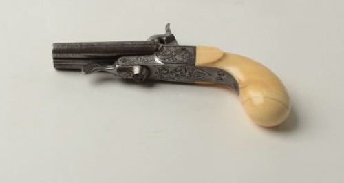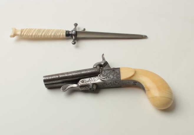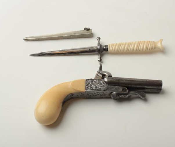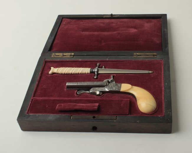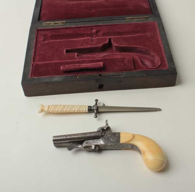 Double barrel pinfire derringer circa 1850s-60s cased with matching ivory handled dagger. In very good condition overall. Rare to fine cased En-suite for a gentleman’s protection. (Antique) Est.: $1750-$3500