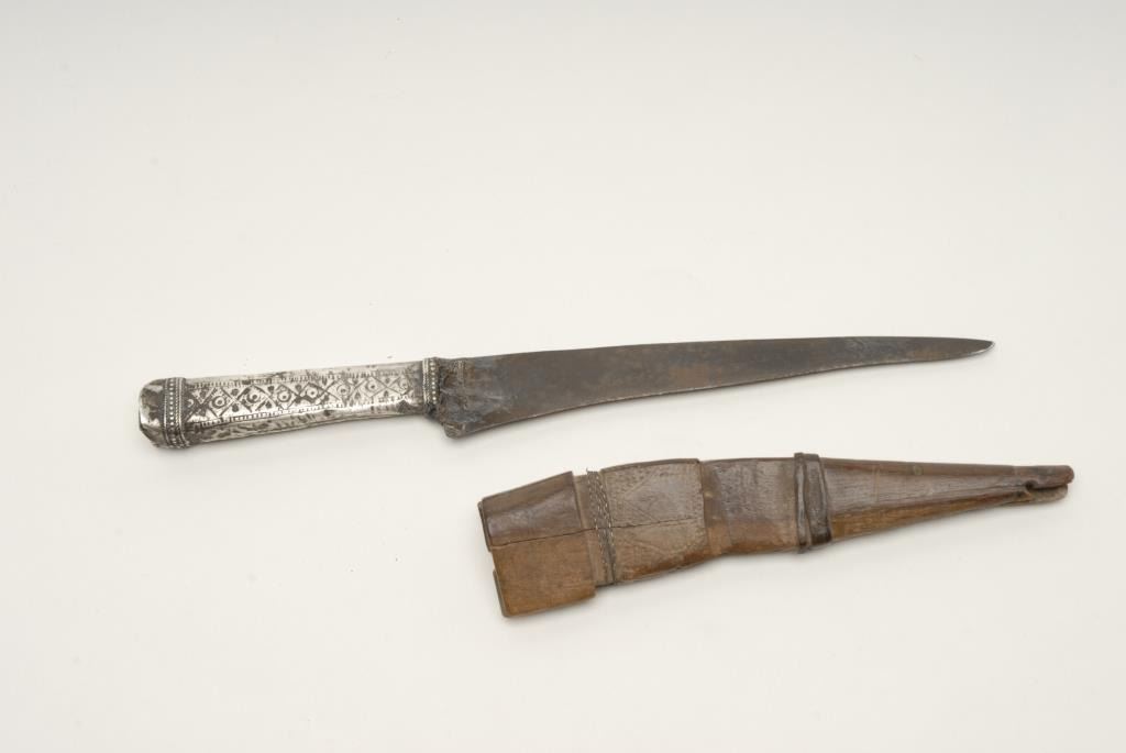 Silver handled dagger from North Africa with leather over wood scabbard. 19th to early 20th century. Blade worn. Fair to good overall. Est.: $150-$300