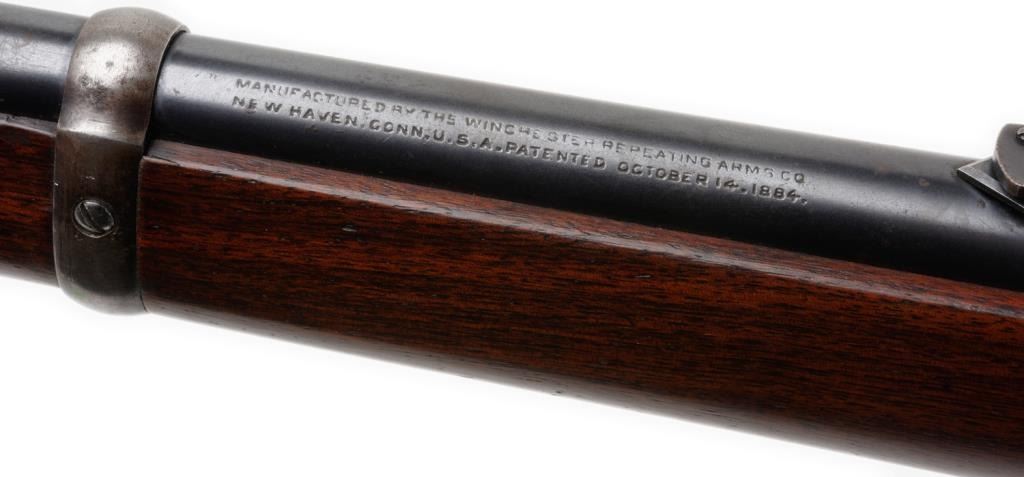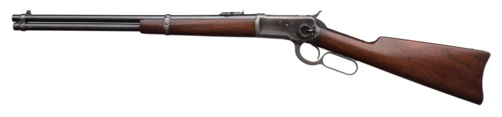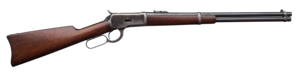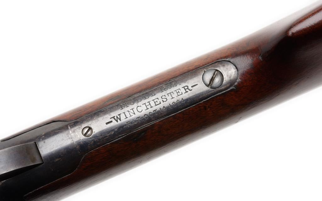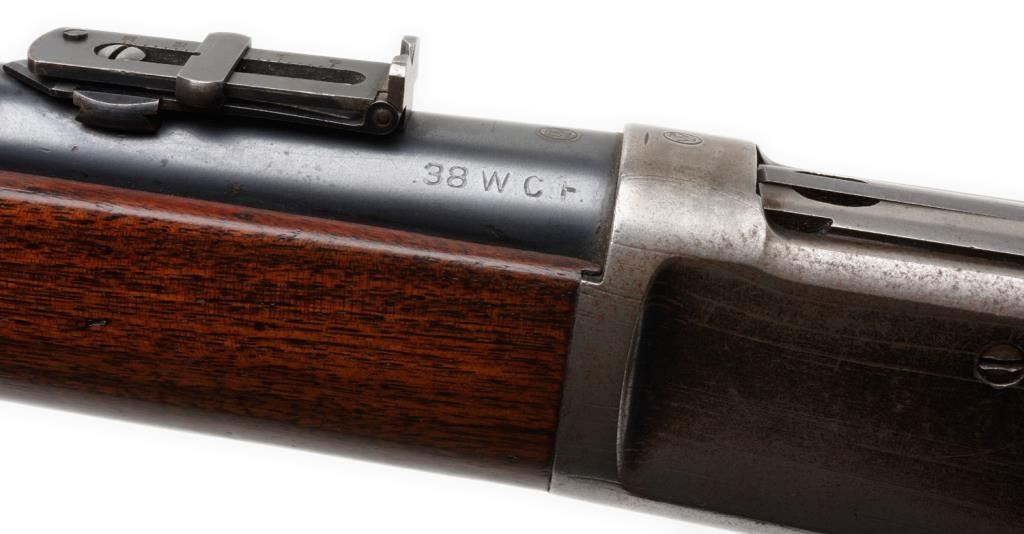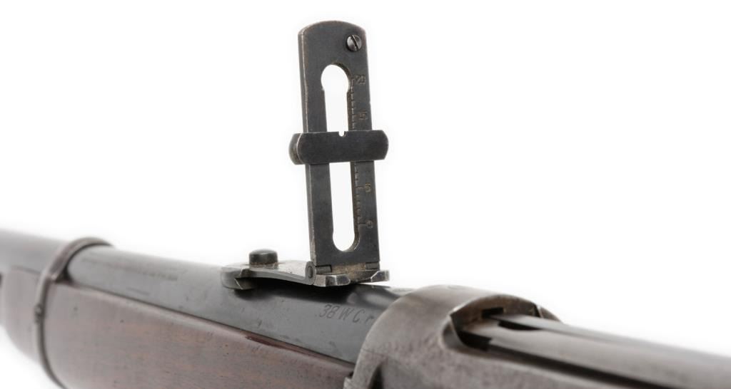 Winchester Model 1892 lever action saddle ring carbine, .38 W.C.F. caliber, 20” barrel, S/N 161154, blued finish, wood stocks in overall very good to near fine condition showing the majority of its original finish on the barrel and loadingtube and considerable original blue on the receiver; crisp action, sharp markings, fine bore and very good to near fine wood. Est.: $2,500-$5,000.