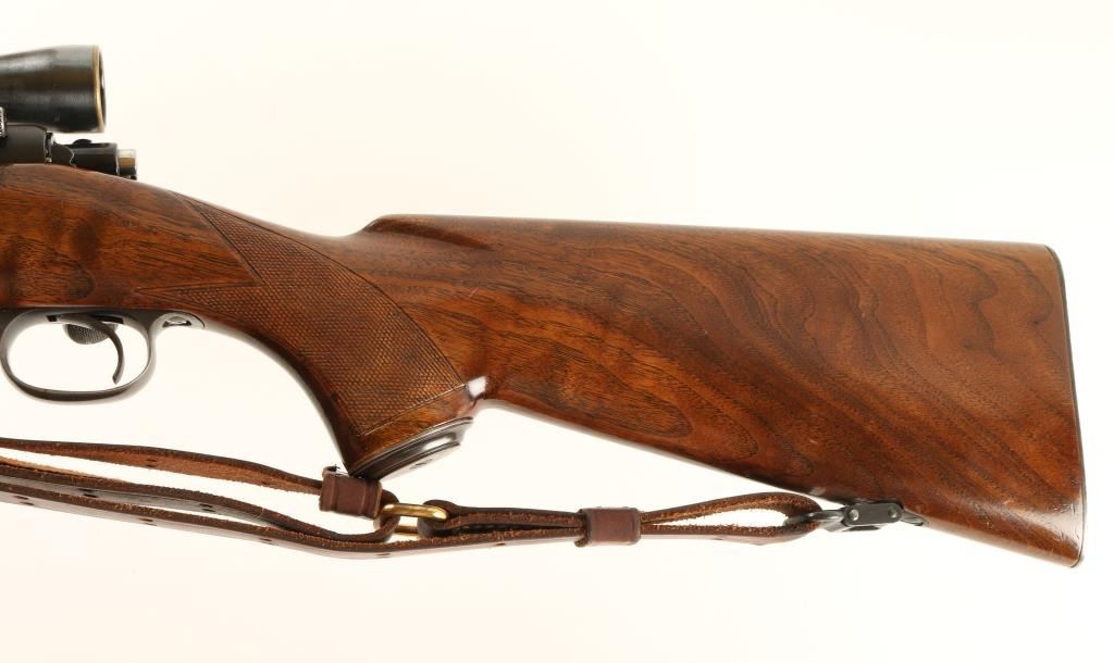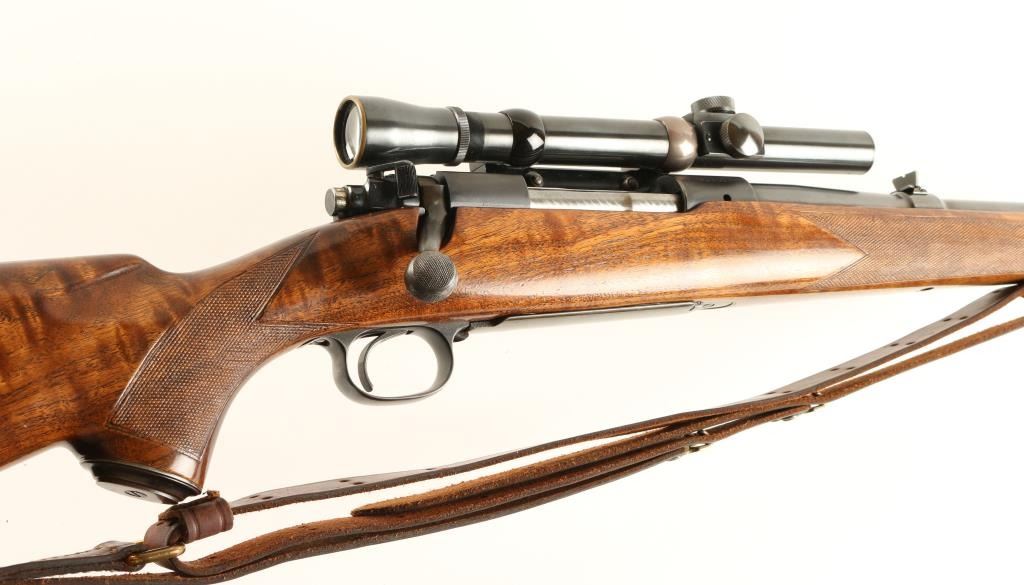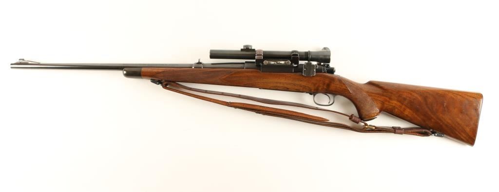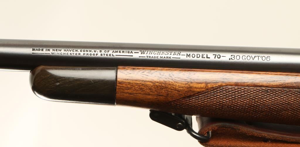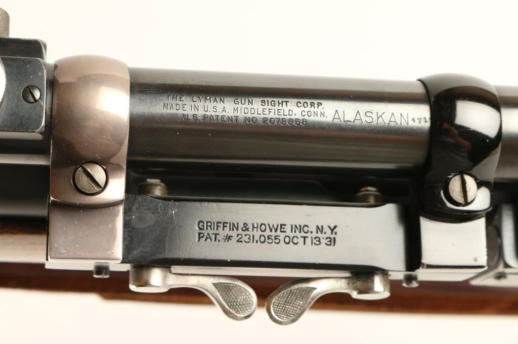 Winchester Model 70 .30Gov't06 S/N 41249 Customized high quality sporting rifle chambered in .30-06 Government, circa 1942. Features a blued finish, 24" tapered barrel, ramped blade front sight, dual folding leaf rear sights, side mounted Griffin & Howe scope base with Lyman Alaskan 2.5x scope, Lyman side mounted adjustable rear sight base, jeweled bolt, serrated trigger, hinged floorplate, checkered bolt handle, flush mount swivel studs,quick release sling swivels, brown leather sling, safety switch on bolt, and hand checked select grade walnut pistol grip shoulder stock with custom forend tip & checkered metal buttplate. Rifleretains approximately 97% strong bluing on barrel & receiver with heavy fading on floorplate, trigger guard, pistol grip cap & buttplate. Action is smooth ,bore is excellent as is the scope, and wood stock is finewith semi-sharp checkering. Condition is near excellent. ***C&R /MODERN EST:$750-1,500