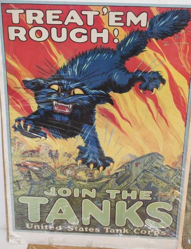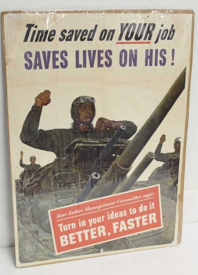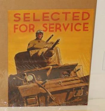 Two great original color WW II Armor advertising posters and a reproduction WW I Armor poster; The two originals include a home front piece dated 1943 that headlines “Time saved on YOUR job Saves Lives On His!”, approximately 41” x 29” with folds and some edge wear, etc.; also a 1941 dated poster of tankers with headline “SELECTED FOR SERVICE” in overall good condition. 26.5” x 21”; The WW I reproduction is in good condition, approximately 34” x 24” and headlines “TREAT ‘EMROUGH”. Est.: $250-$500.