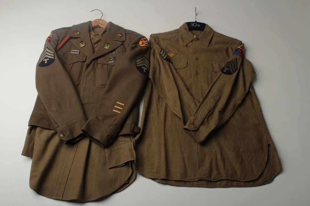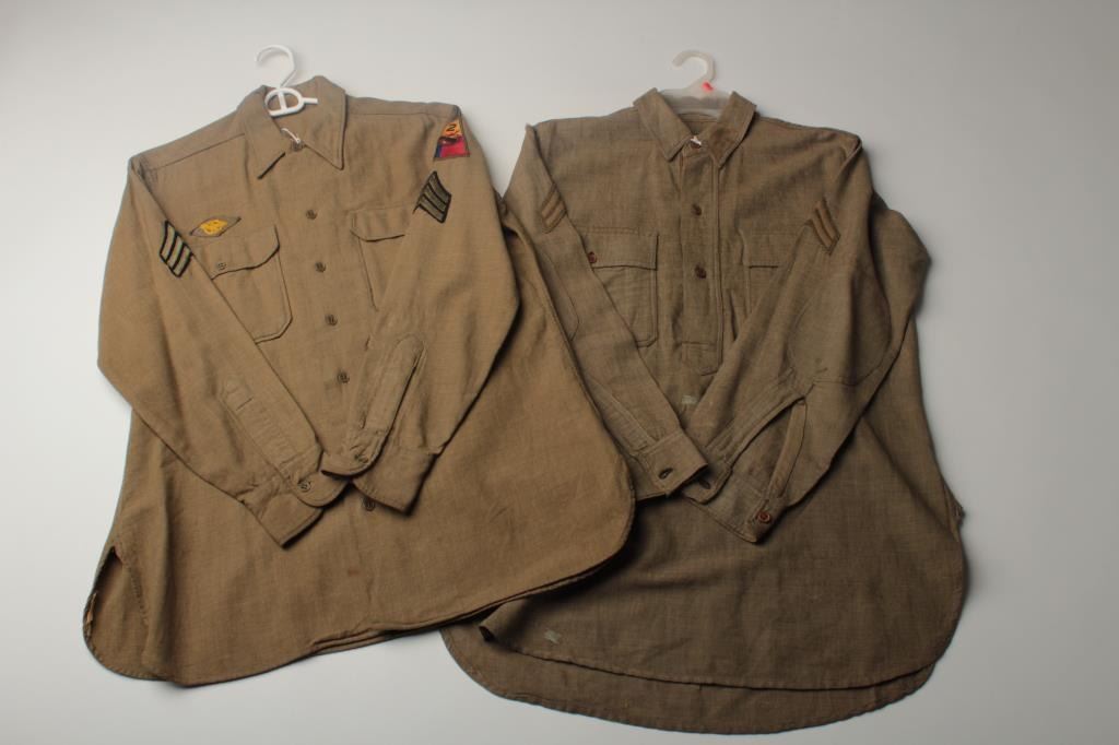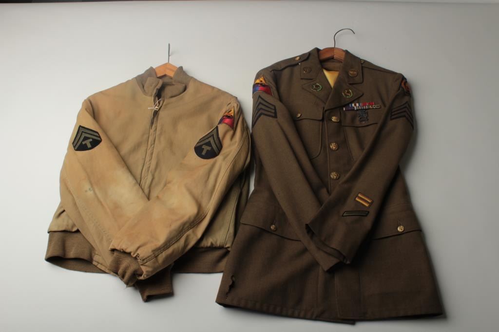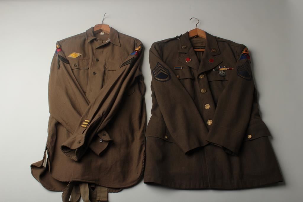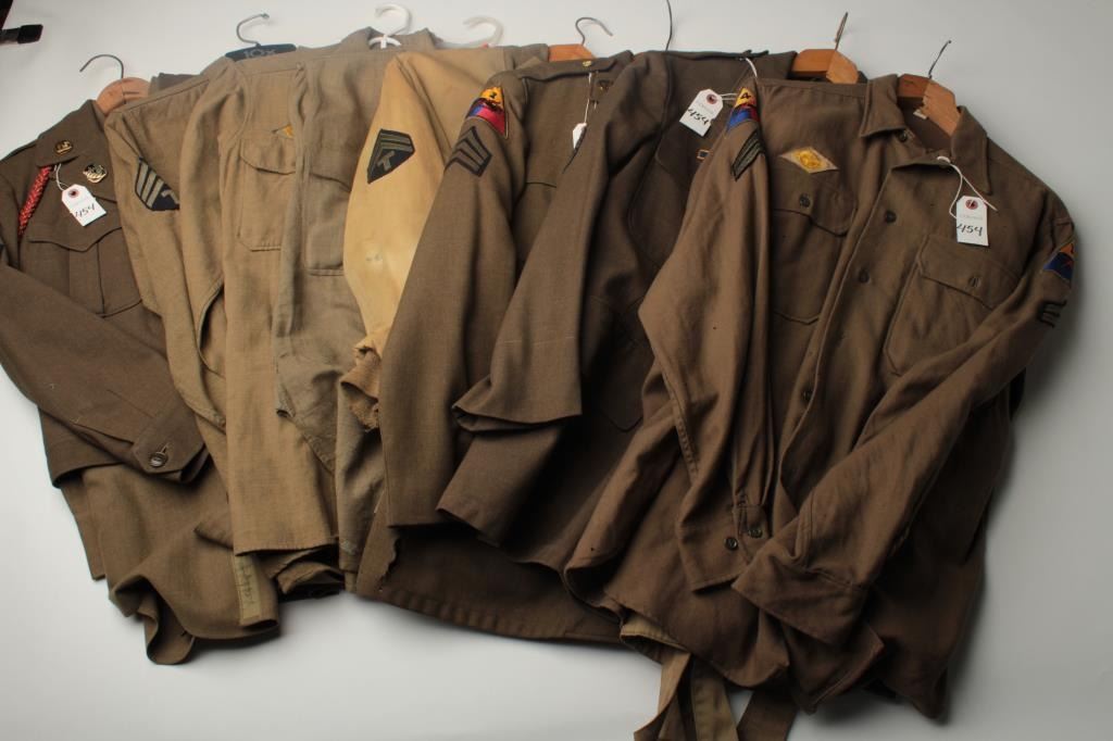 Lot of 8 WW II uniform pieces; there are 3 uniforms in good condition with Armor insignia (1 with 2” hole in front); 3 uniform shirts with insignia (1 with minor moth damage); 1 “Ike” jacket in good condition and 1 Armor jacket ingood used condition. Est.: $400-$800.