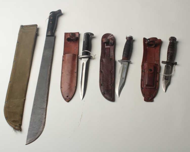 Lot of 4 U.S. military blades and scabbards consisting of a Vietnam period pilot’s survival knife; an M1 bayonet converted to fighting knife; one military issue K-BAR utility knife; also a late U.S. Machete made by Collins & Co. Est.: $150-$300.