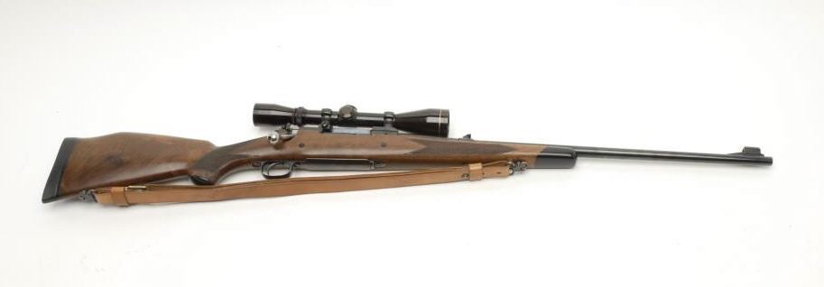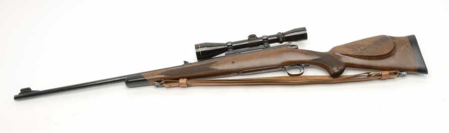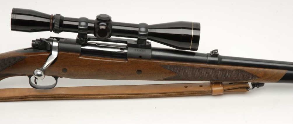 Custom Winchester Model 70 bolt action rifle, 30-06 Springfield cal., serial #372589. The rifle is in very good overall condition with a 24” blued barrel with a hooded ramp front and folding rear sights. The barrel and receiver retain themajority of their blued finish. The bolt handle has been replaced and remains in the white. The checkered wood stock is a replacement. The stock is in very good overall condition with fine graining, an ebony fore end cap and cheek piece.A rubber Pachmayr recoil pad has been added. A Redfield one-piece scope mount has been added along with a Leupold Vari-X II 3 x9 variable power scope. Sling swivels and a military style leather sling have also been added. Est.: $500-$1,000. (C+R).