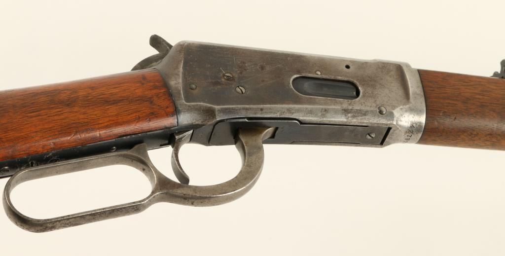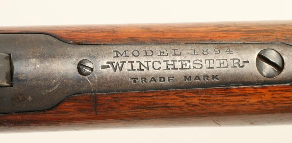 Winchester Model 1894 lever action rifle, desirable .38-55 caliber, 26” round barrel, S/N 427927, “button” half magazine, blued finish, wood stocks in overall very good to near fine condition showing the majority of its originalblue finish on the barrel and traces of original blue in protected areas of the receiver; near fine bore, crisp action and markings, very good to fine wood stocks. (C&R). Est.: $1,500-$3,000.