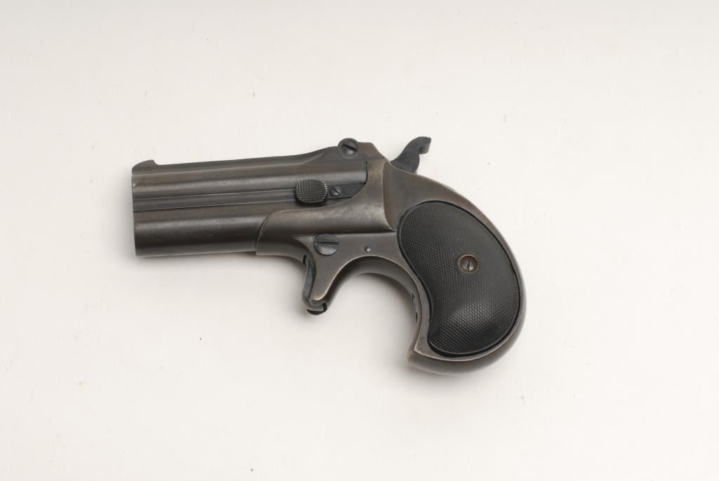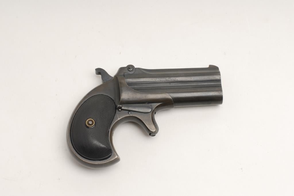 Remington O/U derringer, .41 caliber, 3” barrels, S/N L94786, in overall very good condition showing plum brown patina mixed with areas of original blue finish on metal surfaces; good bores, crisp action and markings, very goodcheckered hard rubber grips. (C&R). Est.: $400-$800.