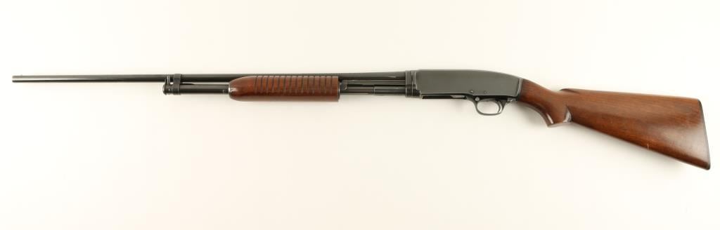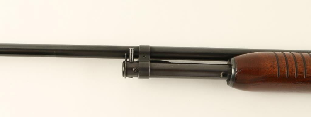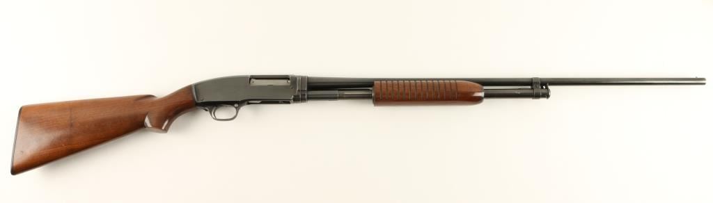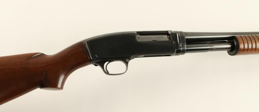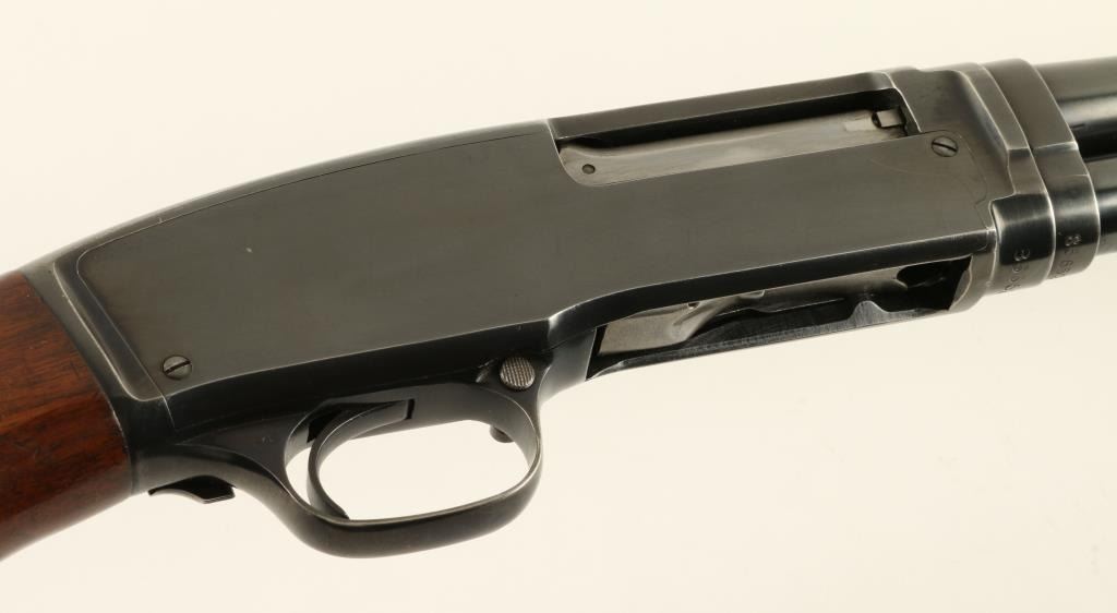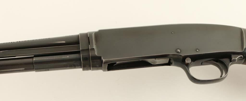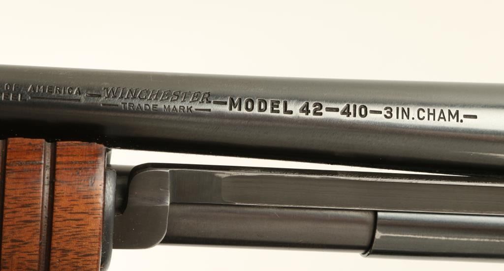 Winchester Model 42 pump action shotgun, .410 gauge, serial #86652. The shotgun is in overall nearly excellent condition with a 28” blued barrel with a steel bead front sight. The barrel and magazine tube retain approximately 90% of theirblued finish with only slight surface marks noted. The receiver retains nearly 90% as well with small scratches noted and slight thinning near the ejection port. The smooth wood stocks are in very good condition with slight mars andcompressions consistent with use. The butt stock ends with a Winchester marked, hard rubber butt plate and a 14” LOP. The bore is excellent, the action crisp and markings sharp on this desirable Model 42. (C+R) Est.: $1,500-$3,000.