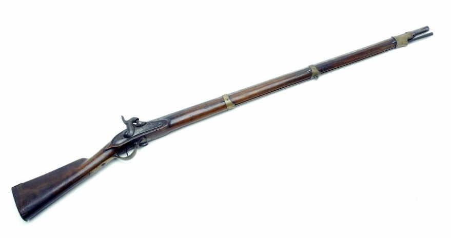 German Federal percussion musket (type imported during the American Civil War); .70 caliber, 41” barrel, brass mounts, full length wood stock, iron ramrod in overall good condition showing a dark patina to metal with scattered pitting aroundfiring area; good action, overall good stock showing honest wear and handling plus crown over FW cartouche on right butt stock and crown over M cartouche on left side of stock above the trigger area. (Antique). Est.: $300-$600.