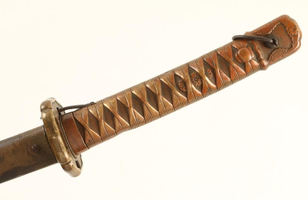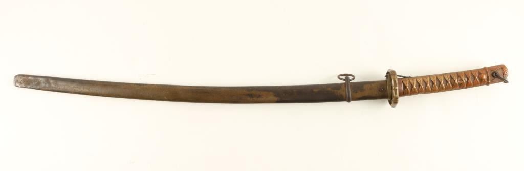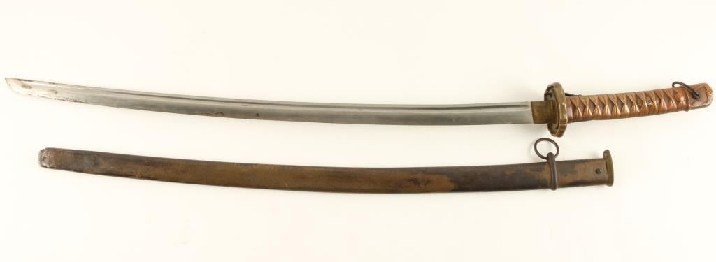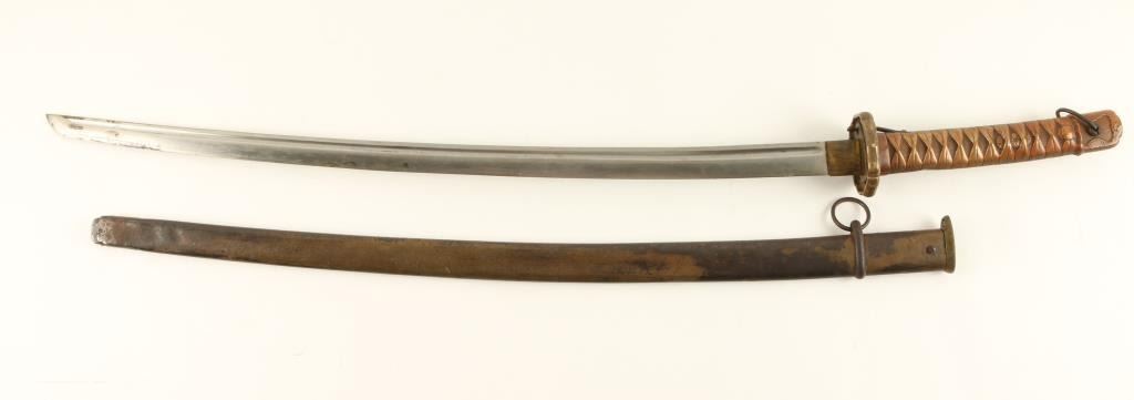 Japanese issue military sword and metal scabbard in overall fair to good condition with #3047 stamped on right side of blade at base. Nice dark patina on brass grip assembly and tsuba; areas of original green paint remaining on scabbard.Est.: $200-$400.