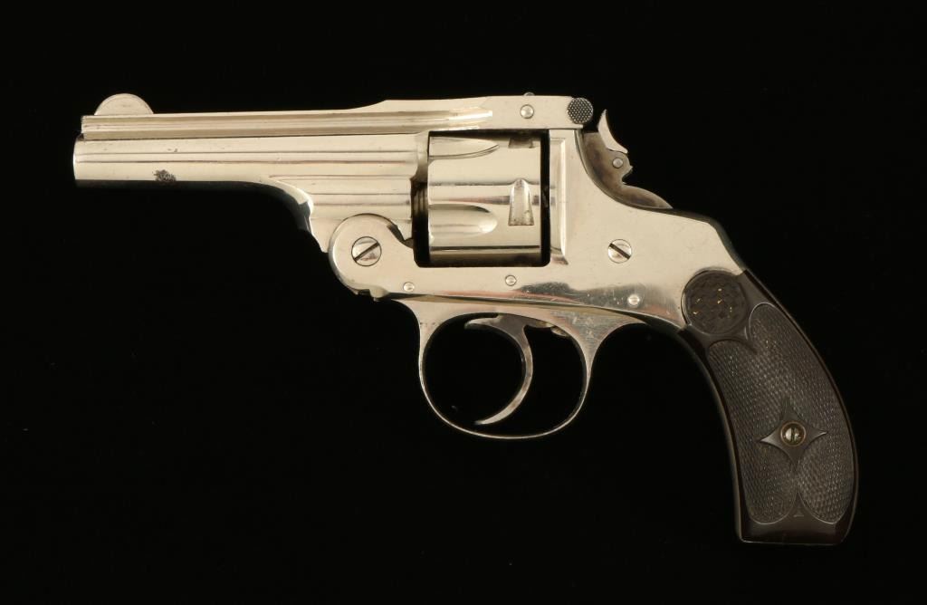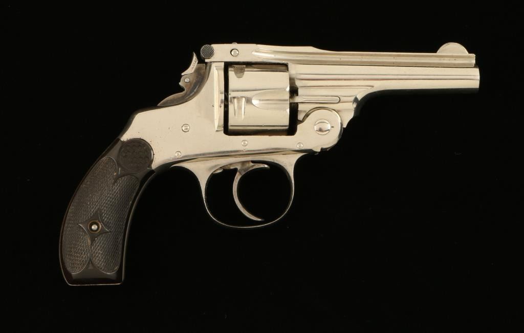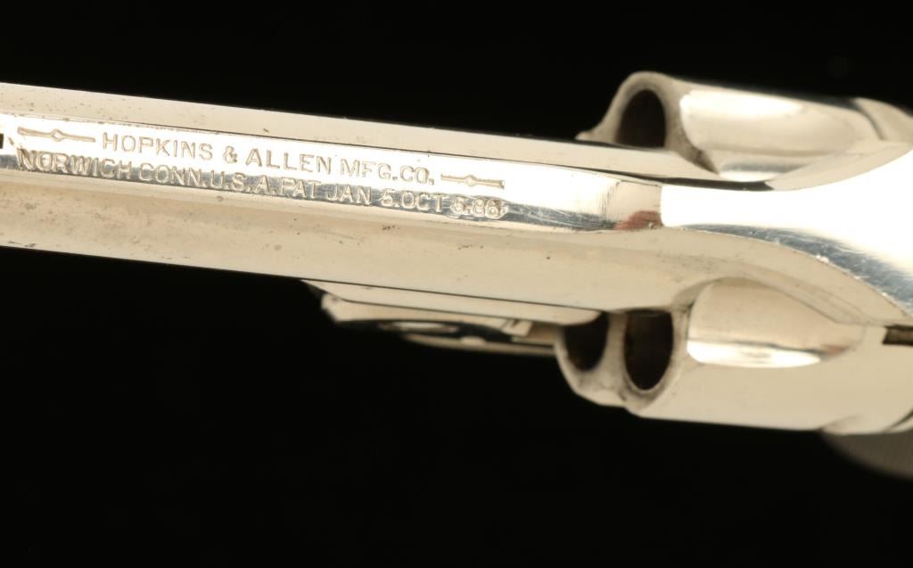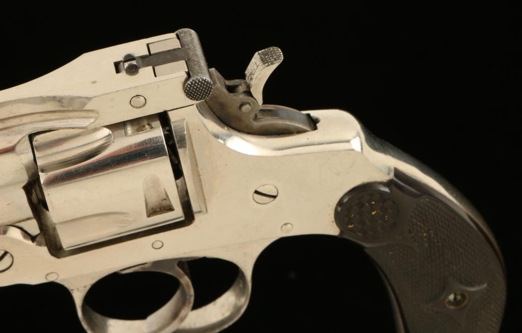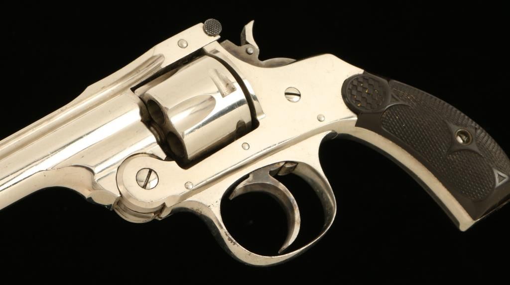 Hopkins & Allen DA top break revolver, .32 caliber, 3” barrel, S/N 69932, nickel finish, folding hammer, checkered hard rubber grips in overall near mint condition. (C&R). Est.: $200-$400.