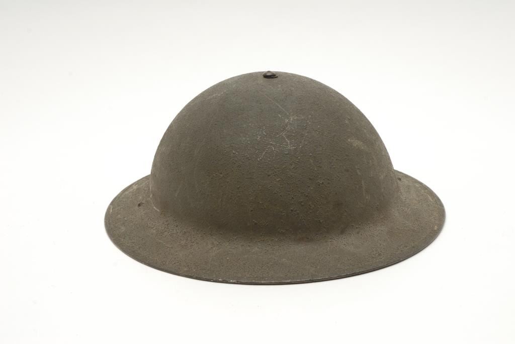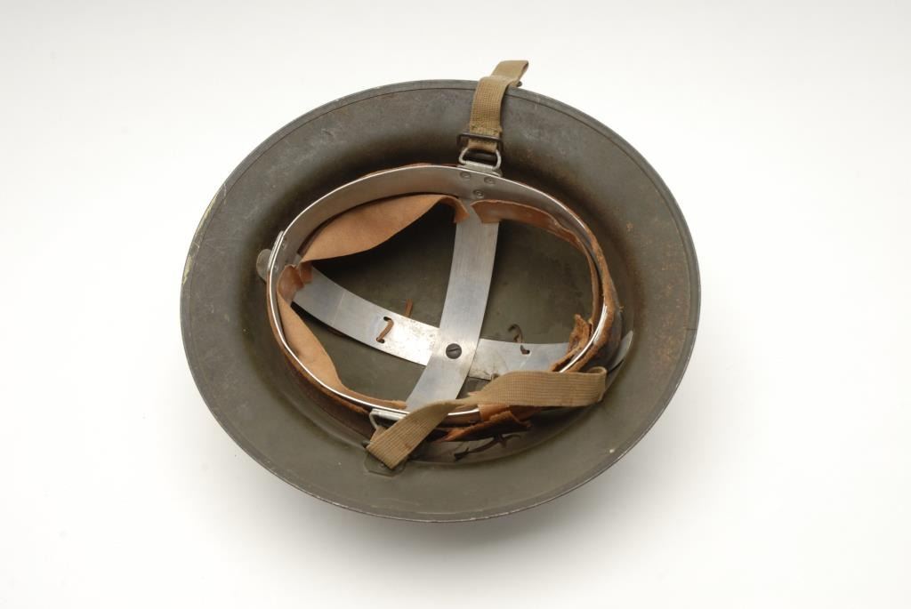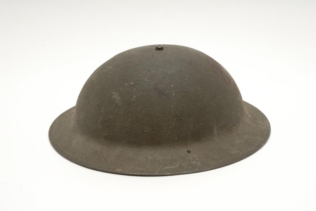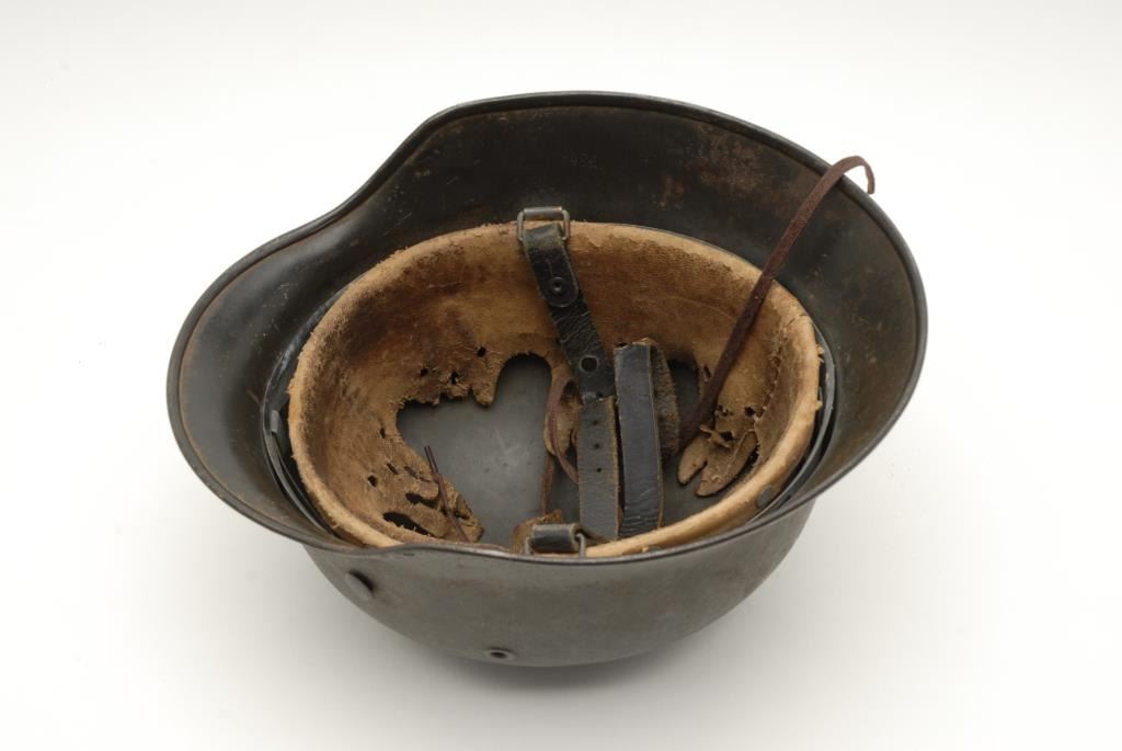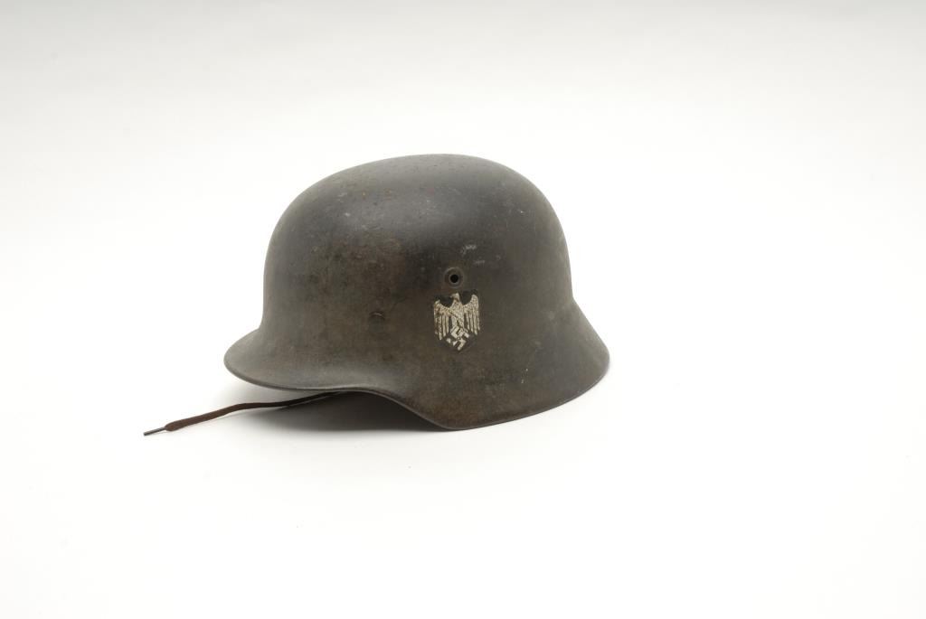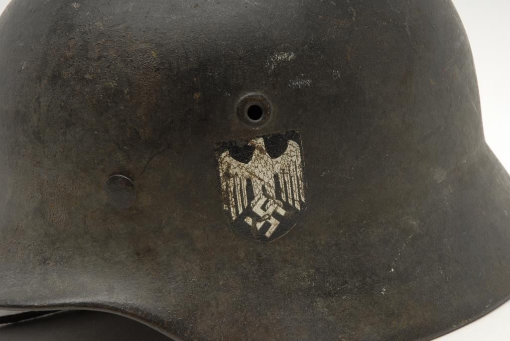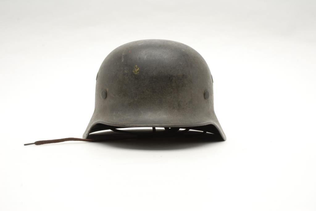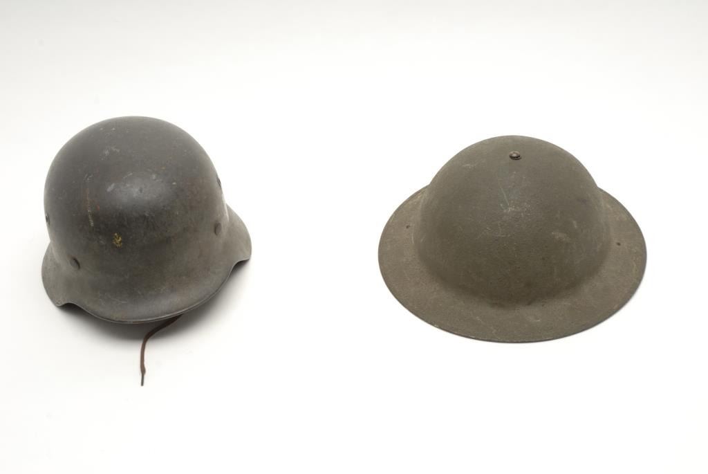 Lot of 2 metal military helmets; one a German helmet with liner, strap and decal on left side, in overall good condition; the other a British helmet in fair condition with liner and strap. Est.: $150-$300.