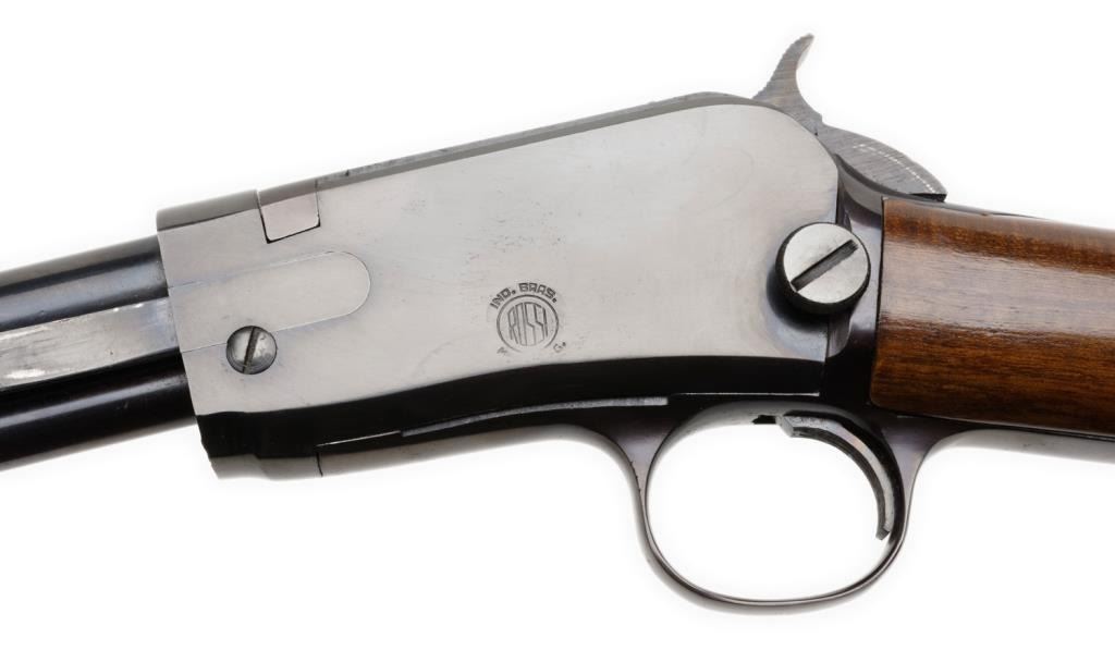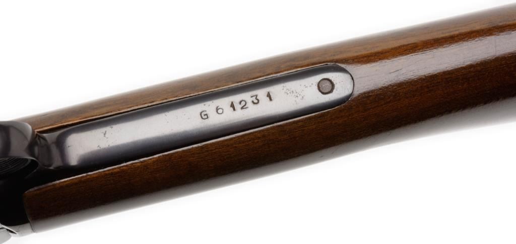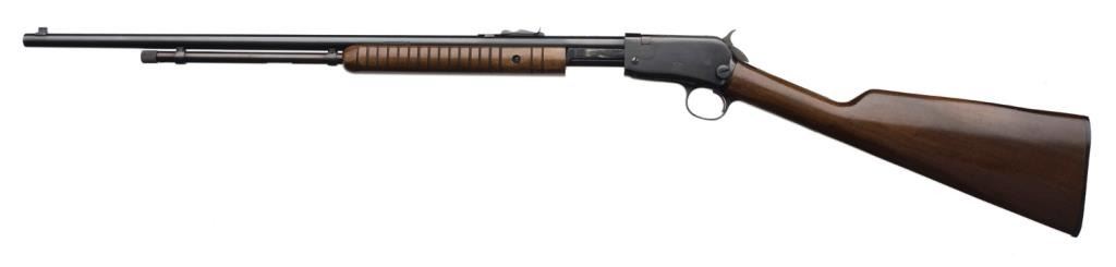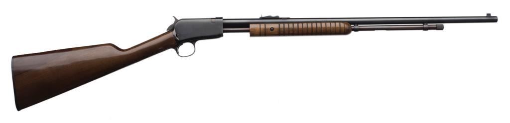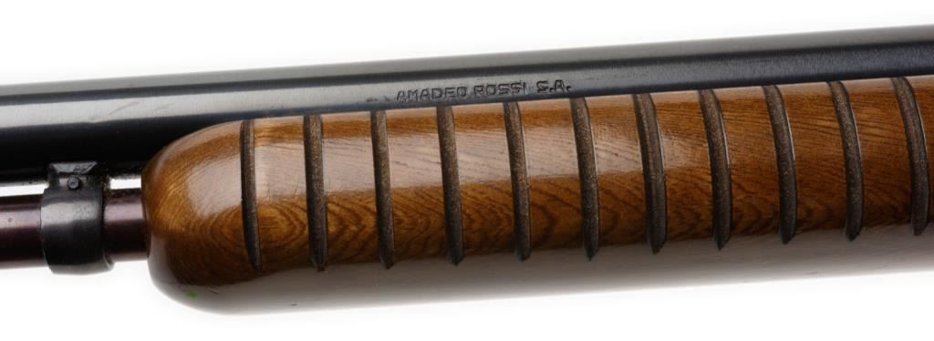 *Rossi pump action rifle, .22 short, long or LR caliber, 23” round barrel, S/N G 61231, blued finish, wood stocks in overall fine condition with the majority of its original blue finish, fine bore, action, markings and wood. Est.:$100-$200.