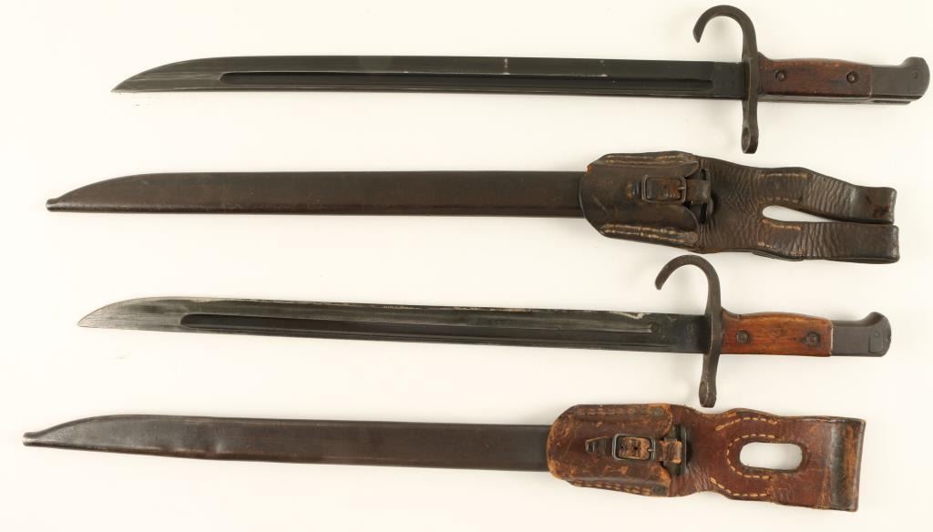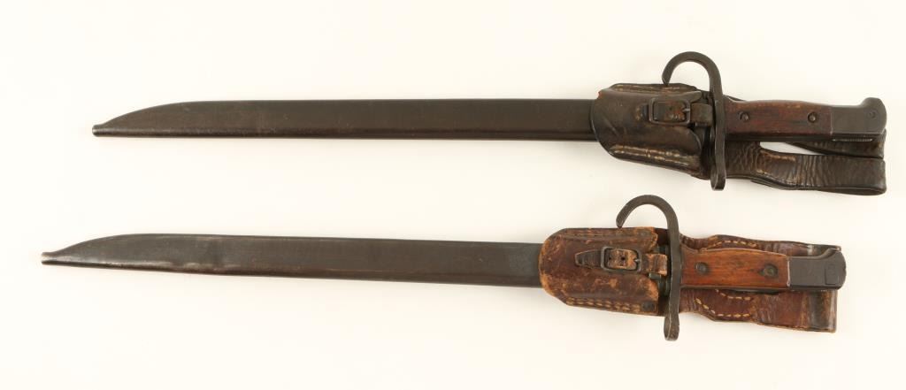 Lot of 2 Japanese bayonets with metal sheaths and leather hangers; both in good to very good condition. Est.: $100-$200.