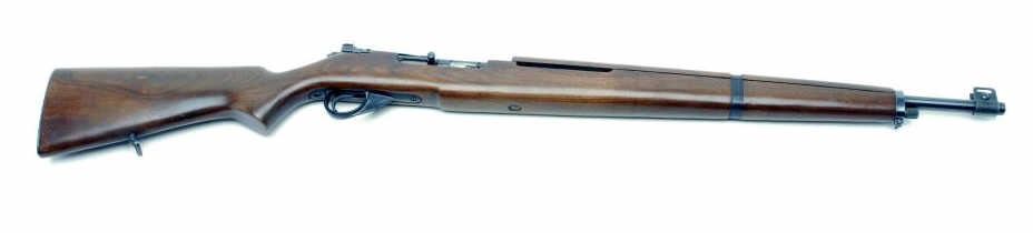 Springfield Arms Model 87M military style training rifle made to resemble the Garand, .22 caliber, semi-automatic, no visible S/N, blued finish, 23.5” 870 barrel, wood stock in overall excellent condition with a fine bore, crisp action, overallfine wood, sharp markings and checkered steel butt plate. (C&R/PPT). Est.: $300-$600.